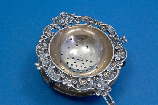Antique tea strainer with special rococo decorations made of 800 silver, 1900