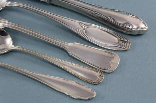 Mix and match silverware set with fork, spoon and knife, dinner cutlery set, art nouveau, mid century
