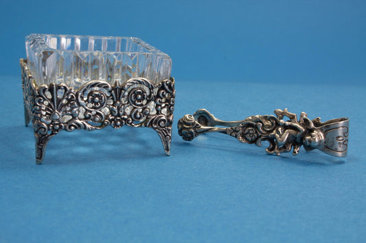 Rare sweetener bowl with matching sugar tongs, 835 silver, crystal glass sugar bowl