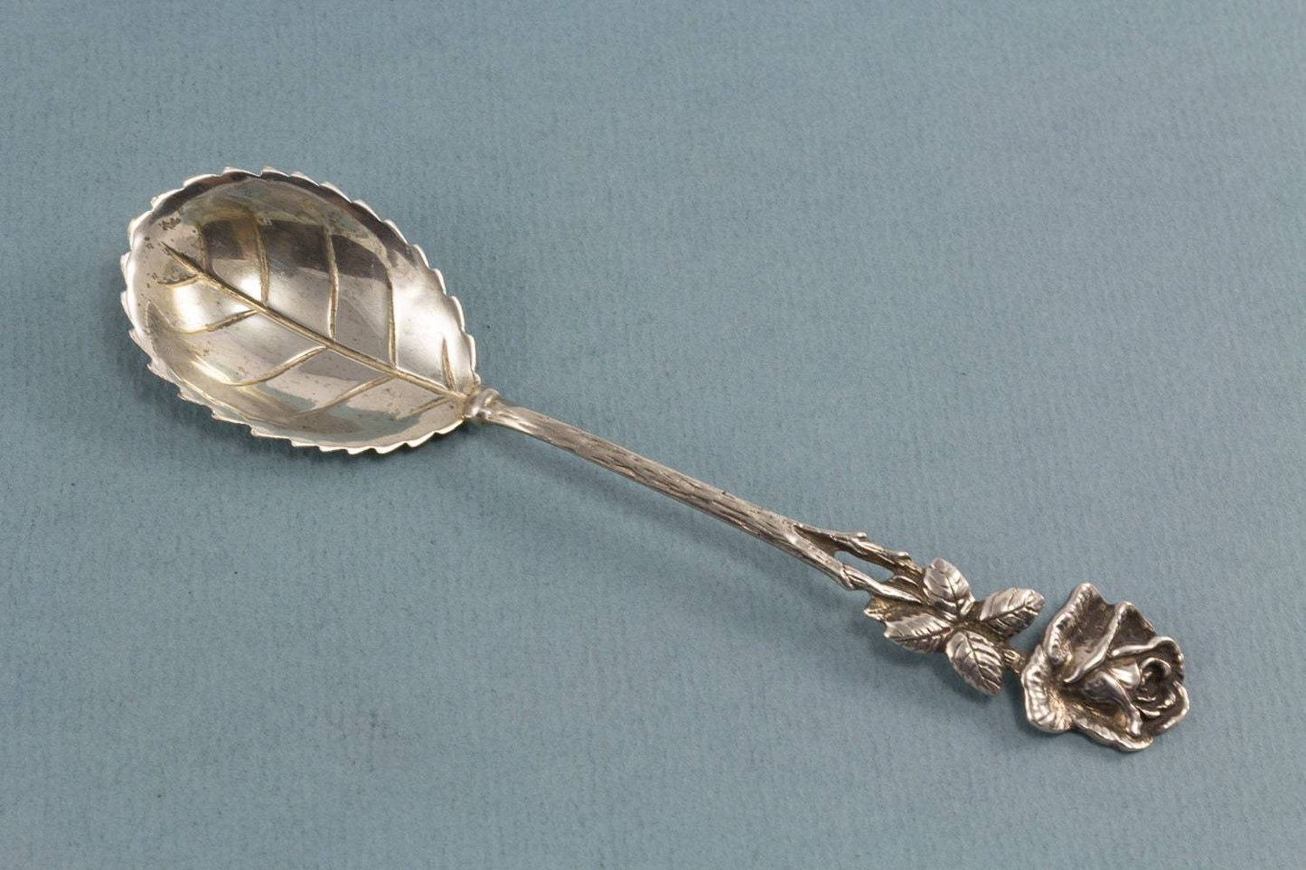 A small sugar spoon made of silver with a finely crafted Hildesheim rose decoration. The spoon is shaped like a rose petal. The sugar spoon is made of 800 silver. Beautiful vintage piece from the time of Christoph Widmann for very special occasions.