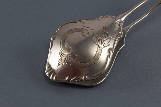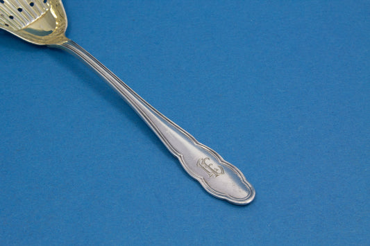 Cucharón grande, antiguo, art nouveau, plateado, cucharón perforador