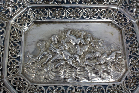 Cuenco de plata maravilloso, putti con delfín, plata, 800, antiguo