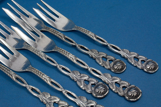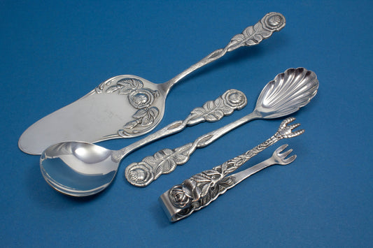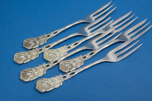 6 tenedores de pastel de rosa plateados con cuchara de crema a juego