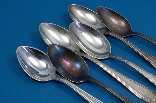 6 cucharaditas plateadas, mezclar y combinar, shabby chic, fotografía de alimentos