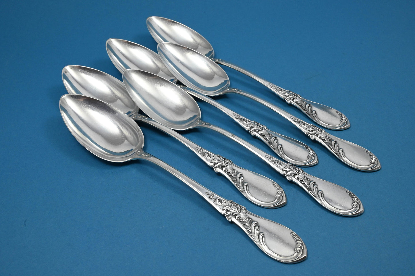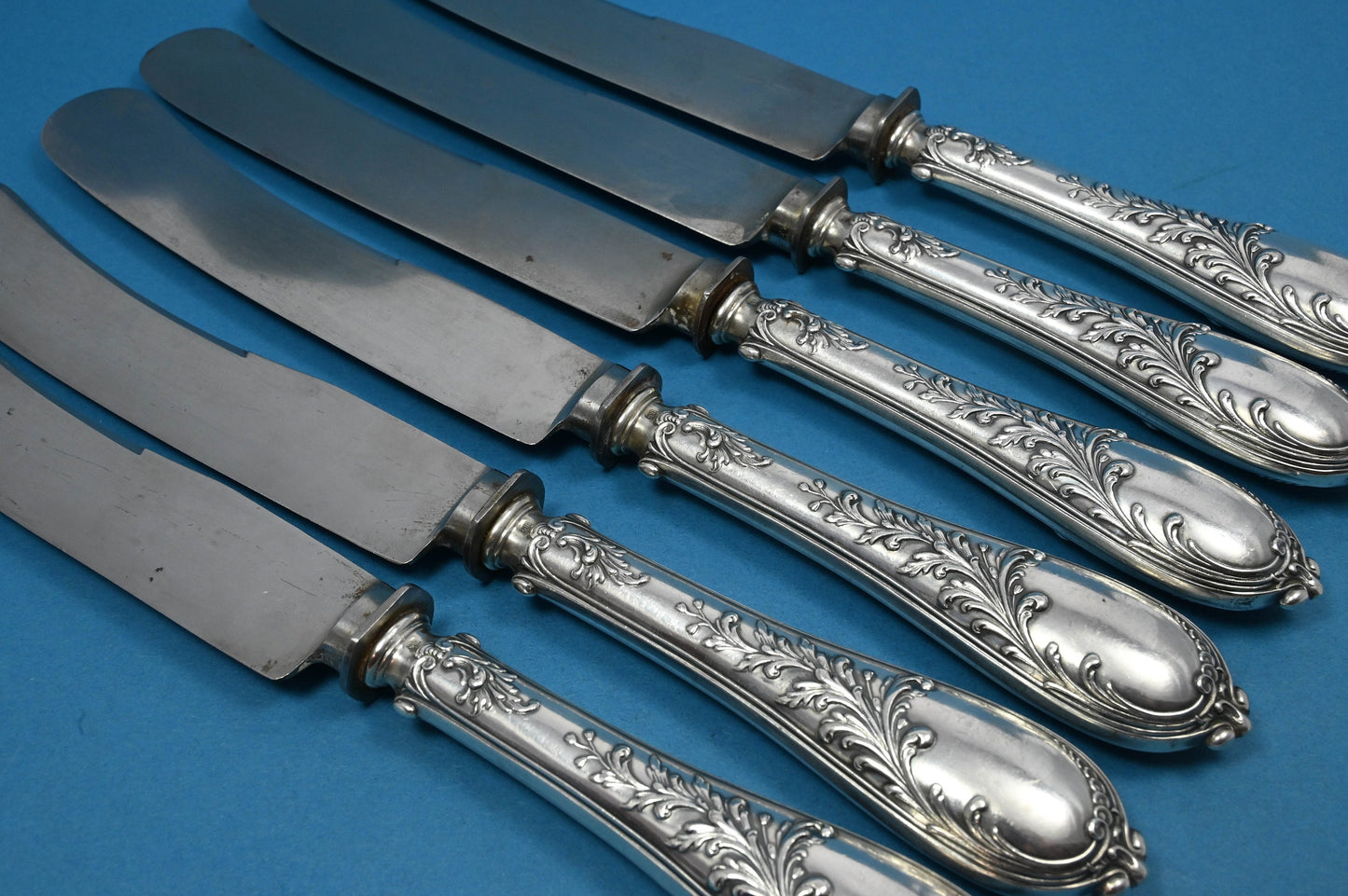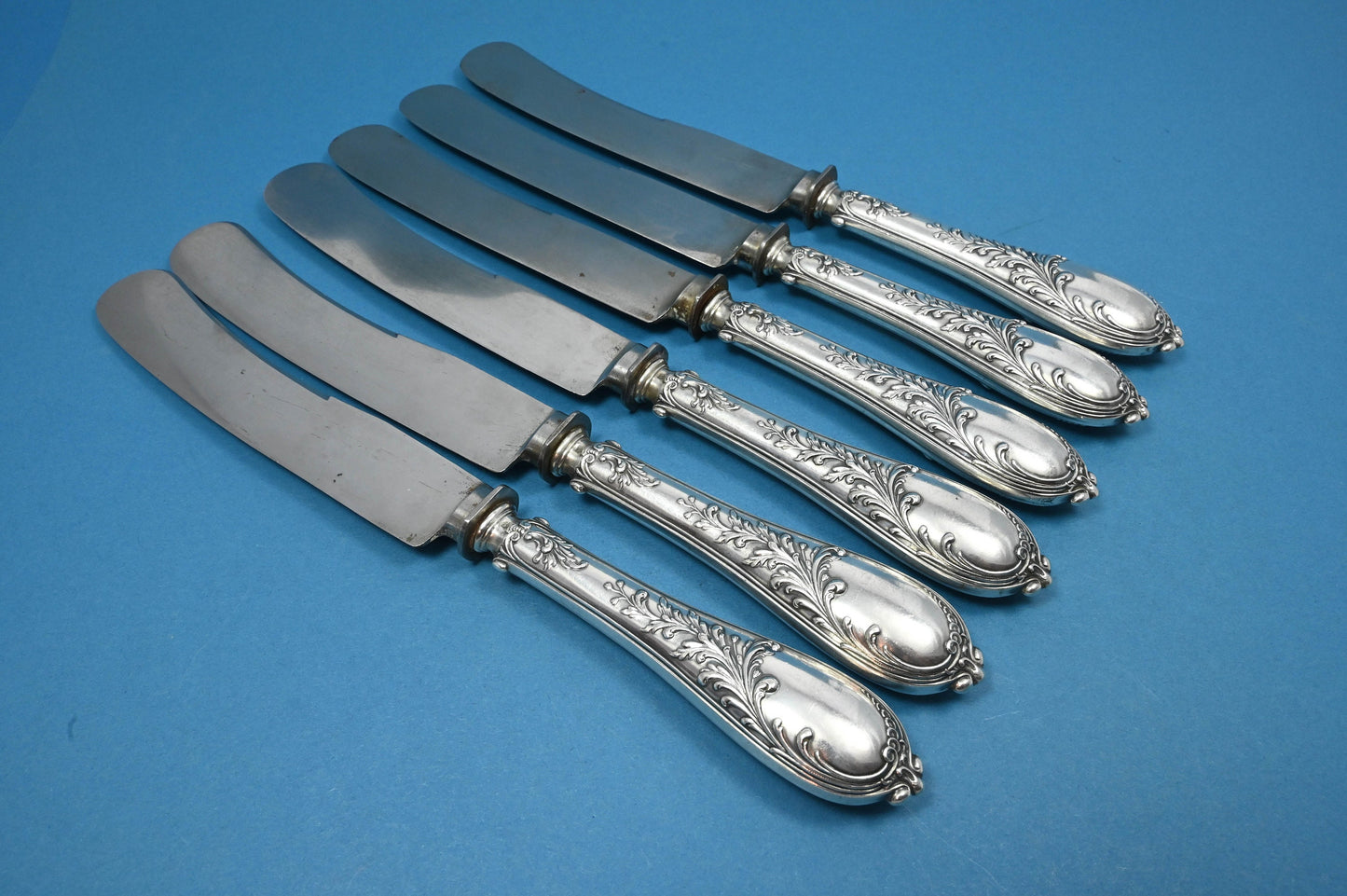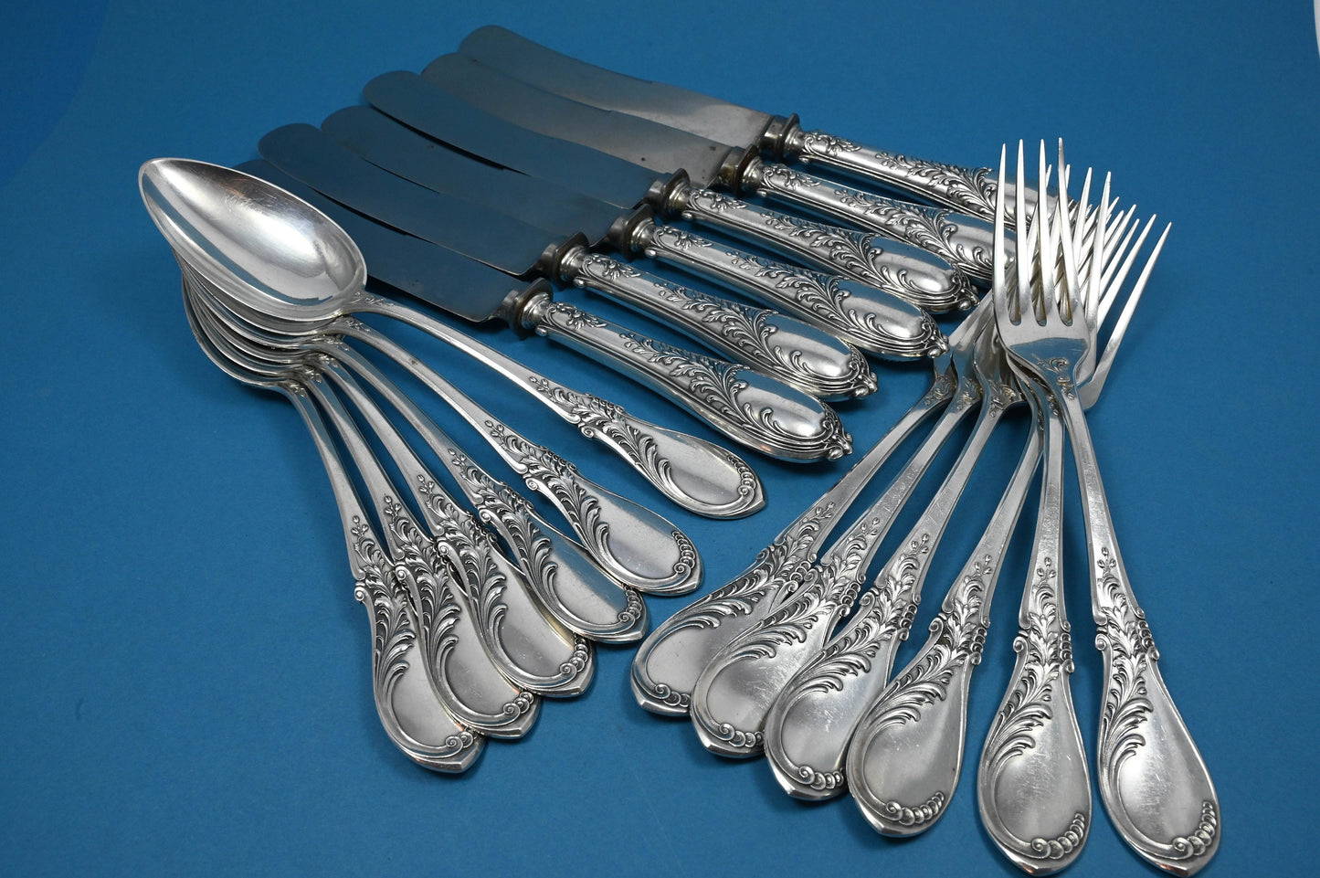 Dieses antike Besteck-Set für 6 Personen aus der Zeit um 1910 besteht aus 6 Tafelgabeln, 6 Messern und 6 Esslöffeln. Ein zeitloses und elegantes Besteck für das perfekte Dinner.