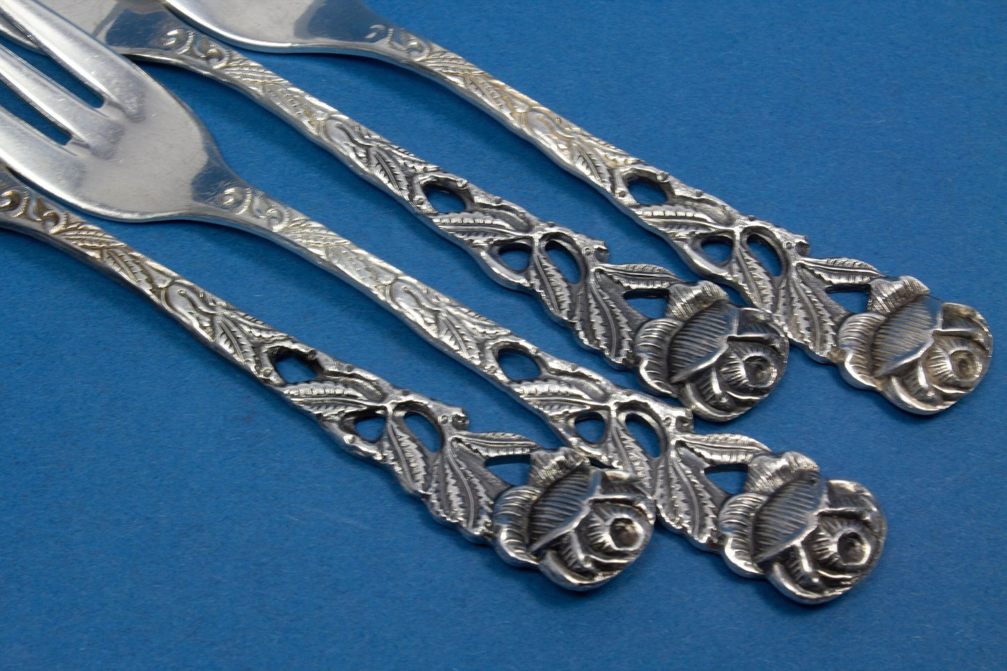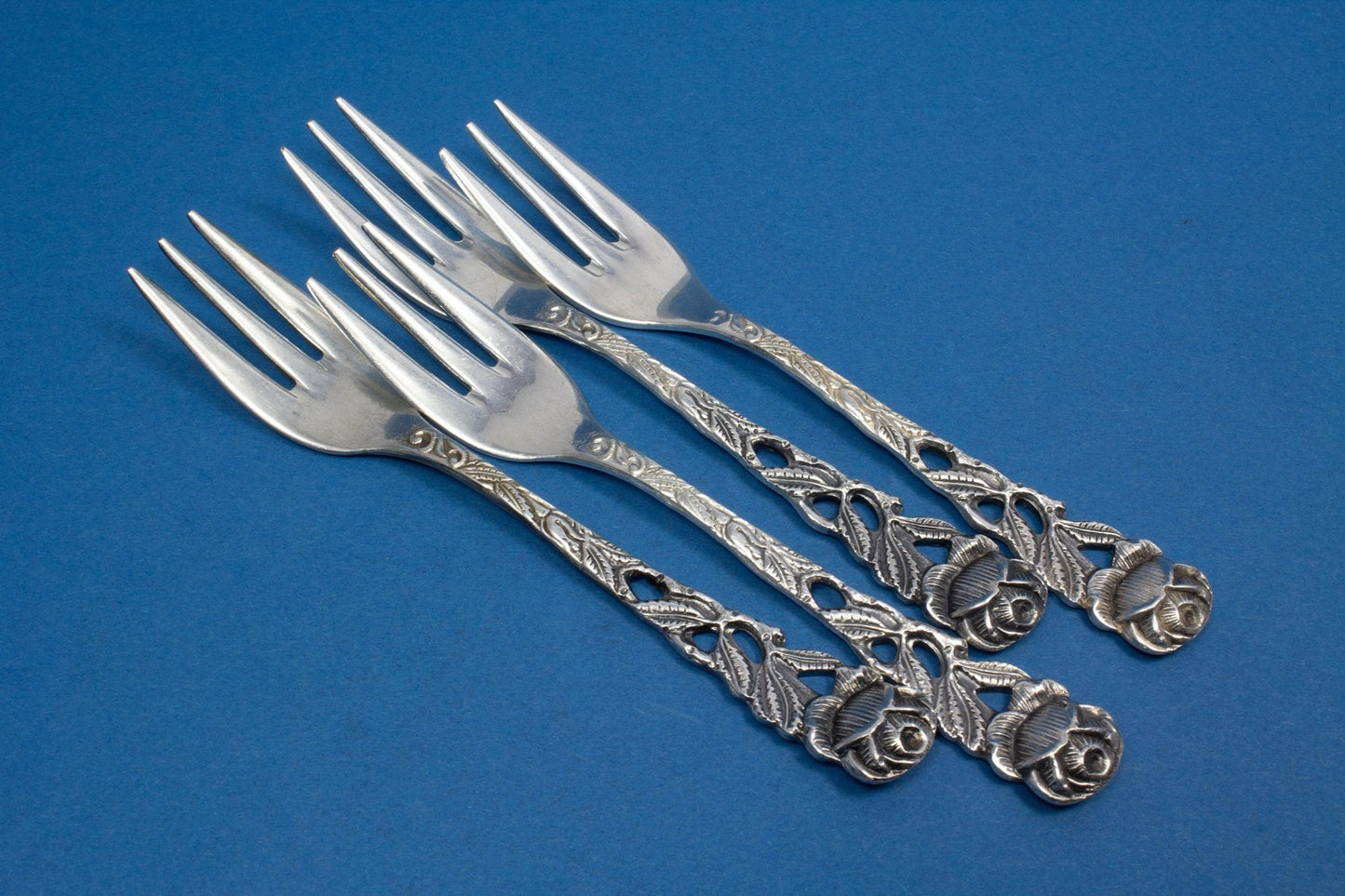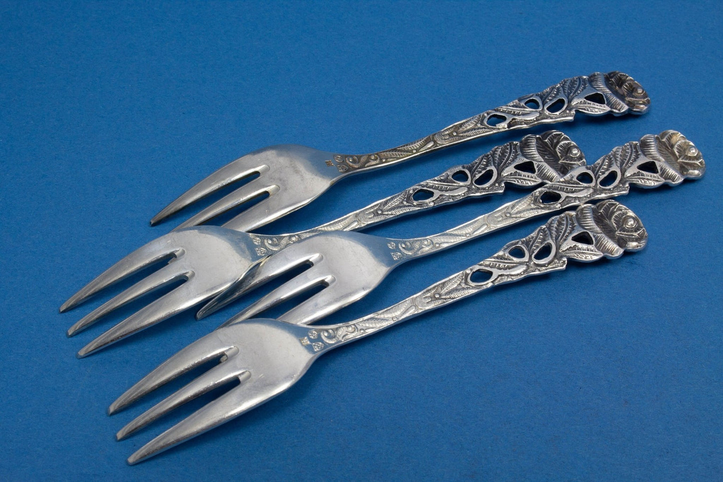 4 fourchettes à gâteau en métal argenté avec roses, fourchettes en métal argenté