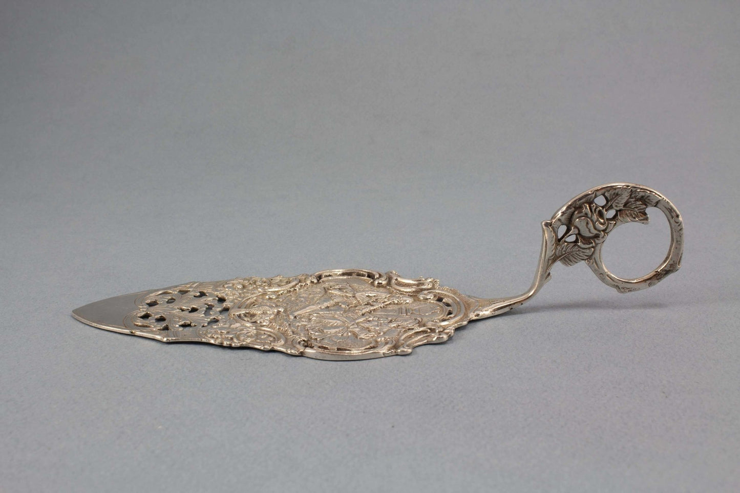 Pelle à pâtisserie en argent noble avec scène d'amour, couple musicien et tourtereaux, argent 800