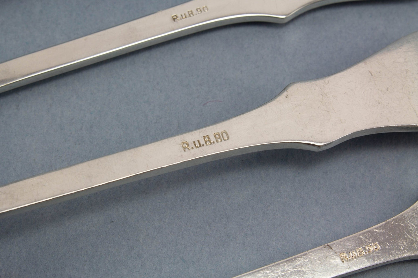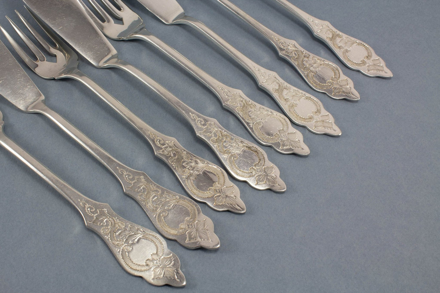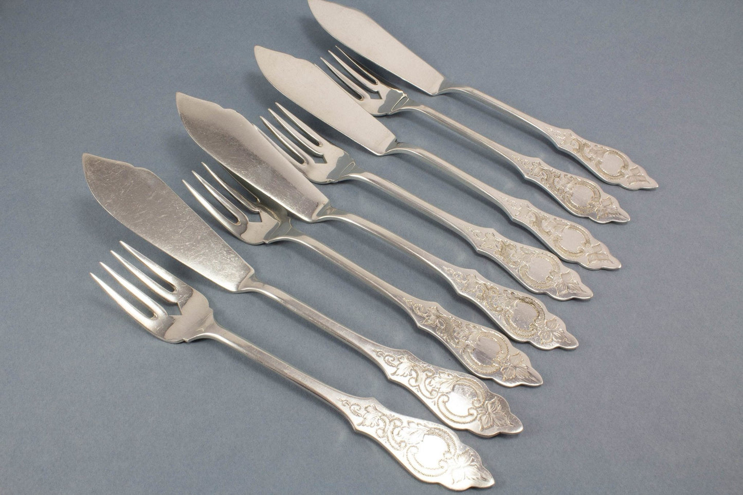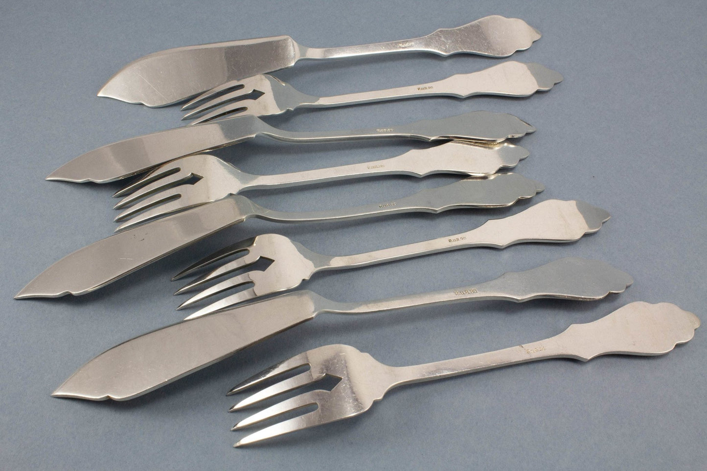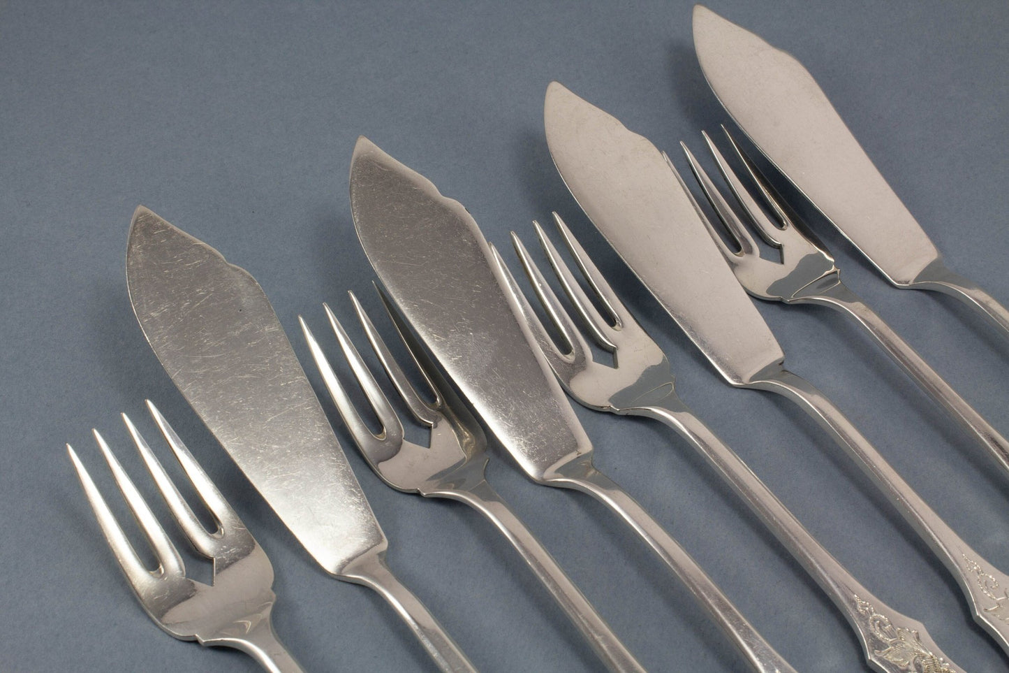 Couverts à poisson de Robbe et Berking, fourchette à poisson et couteau à poisson en métal argenté pour 4 personnes dans le modèle de la Frise orientale