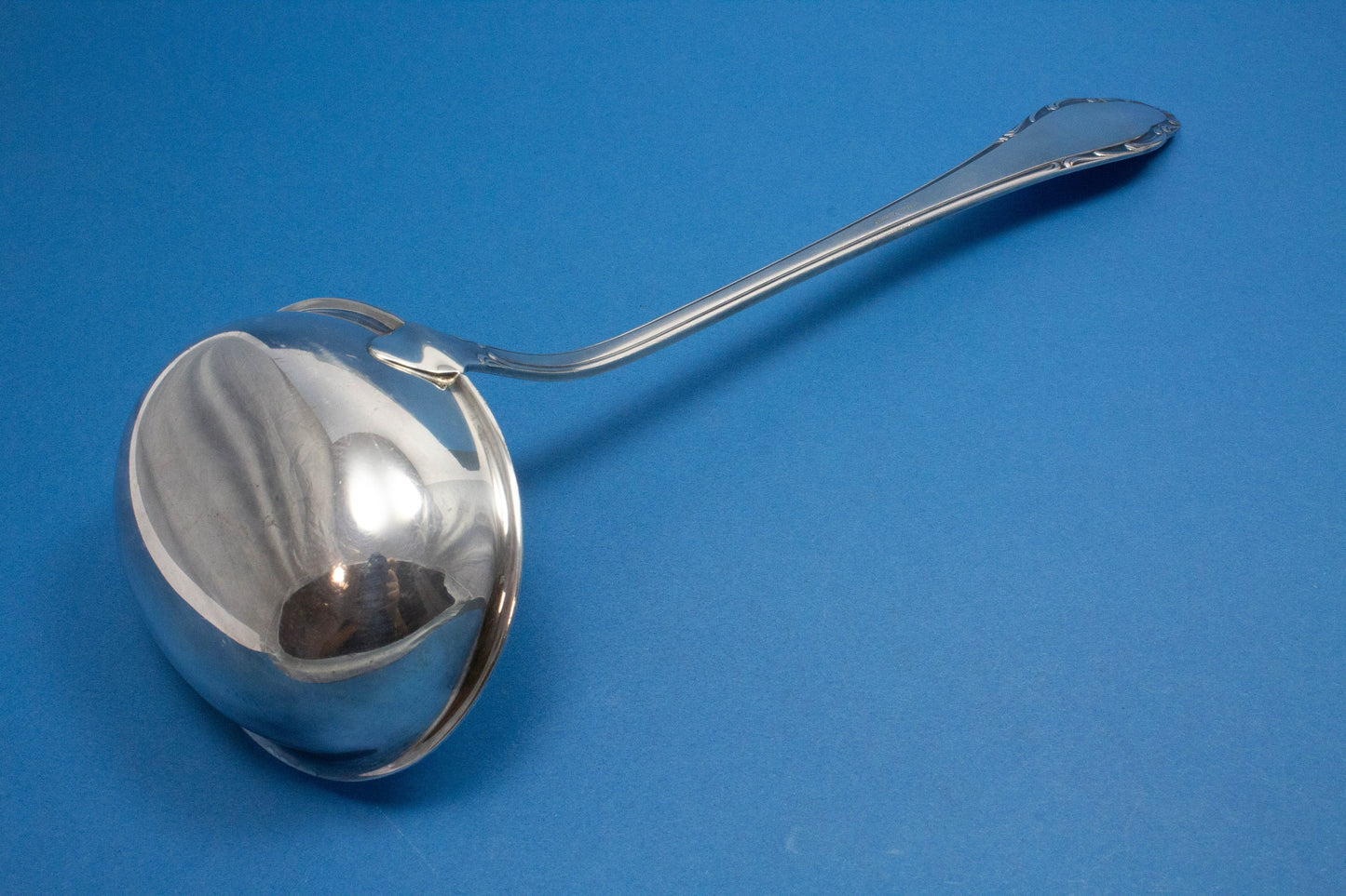 Cette louche à soupe plaquée argent présente un joli motif et est idéale pour les grandes marmites à soupe.