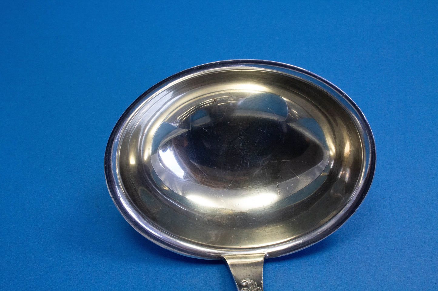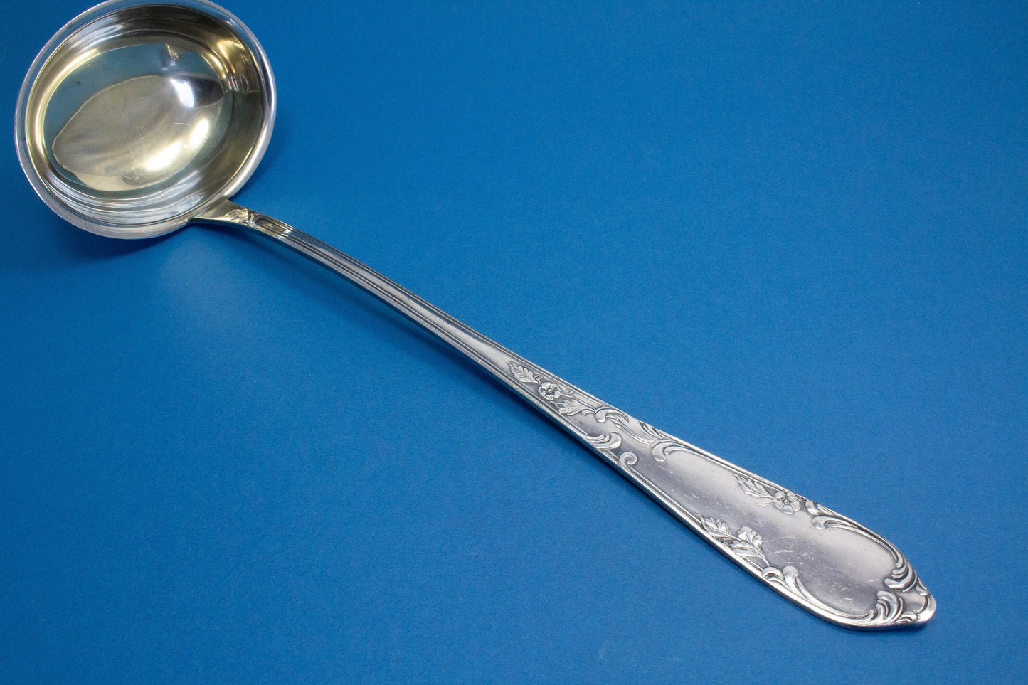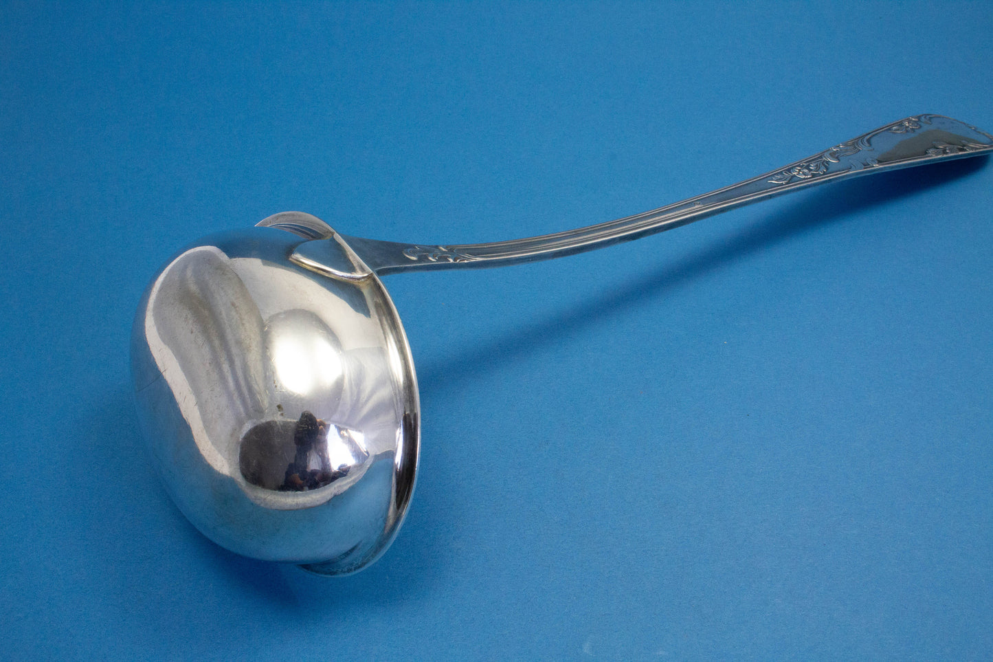Cette louche à soupe plaquée argent présente un joli motif et est idéale pour les grandes marmites à soupe.