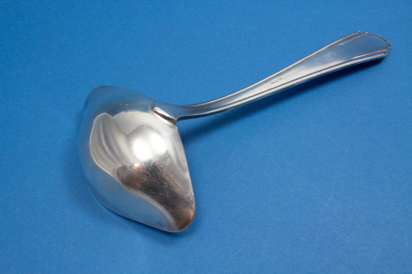 Une louche à sauce en métal argenté avec un joli motif.