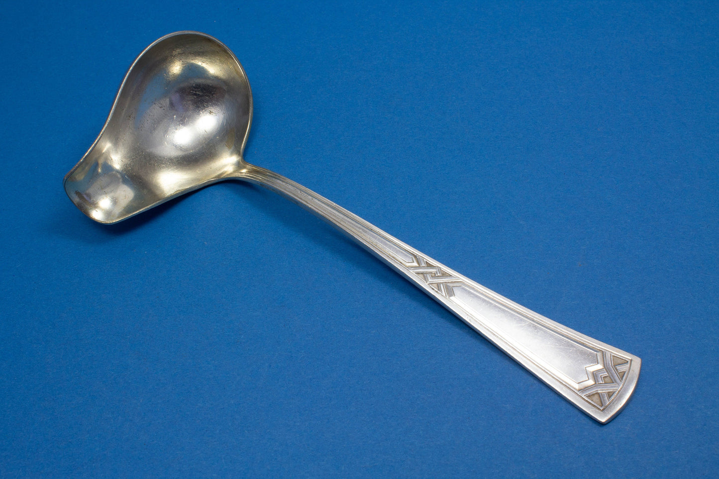 Une louche à sauce en métal argenté avec un joli motif.