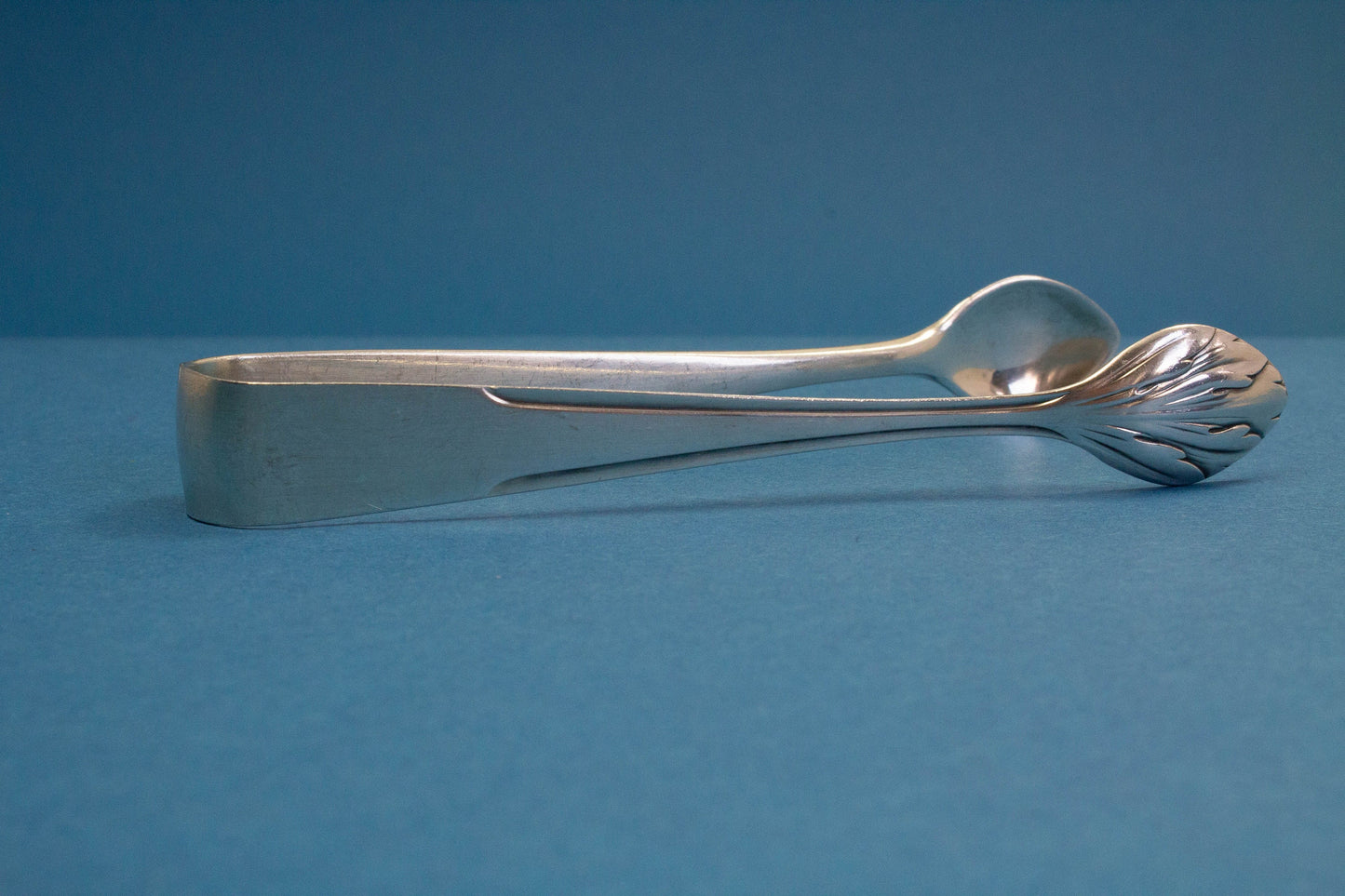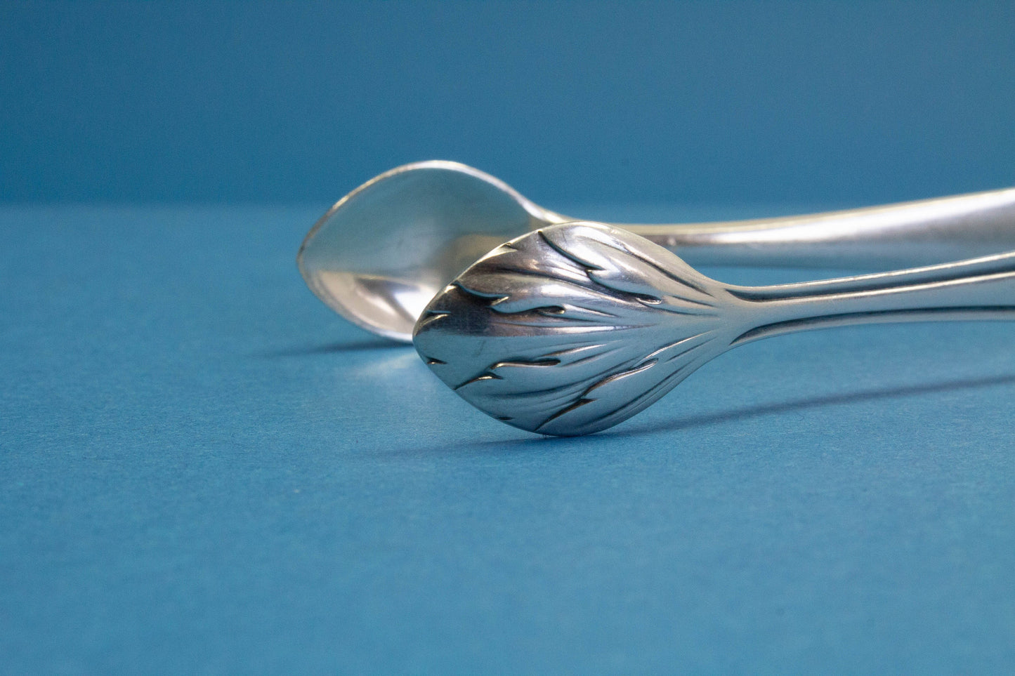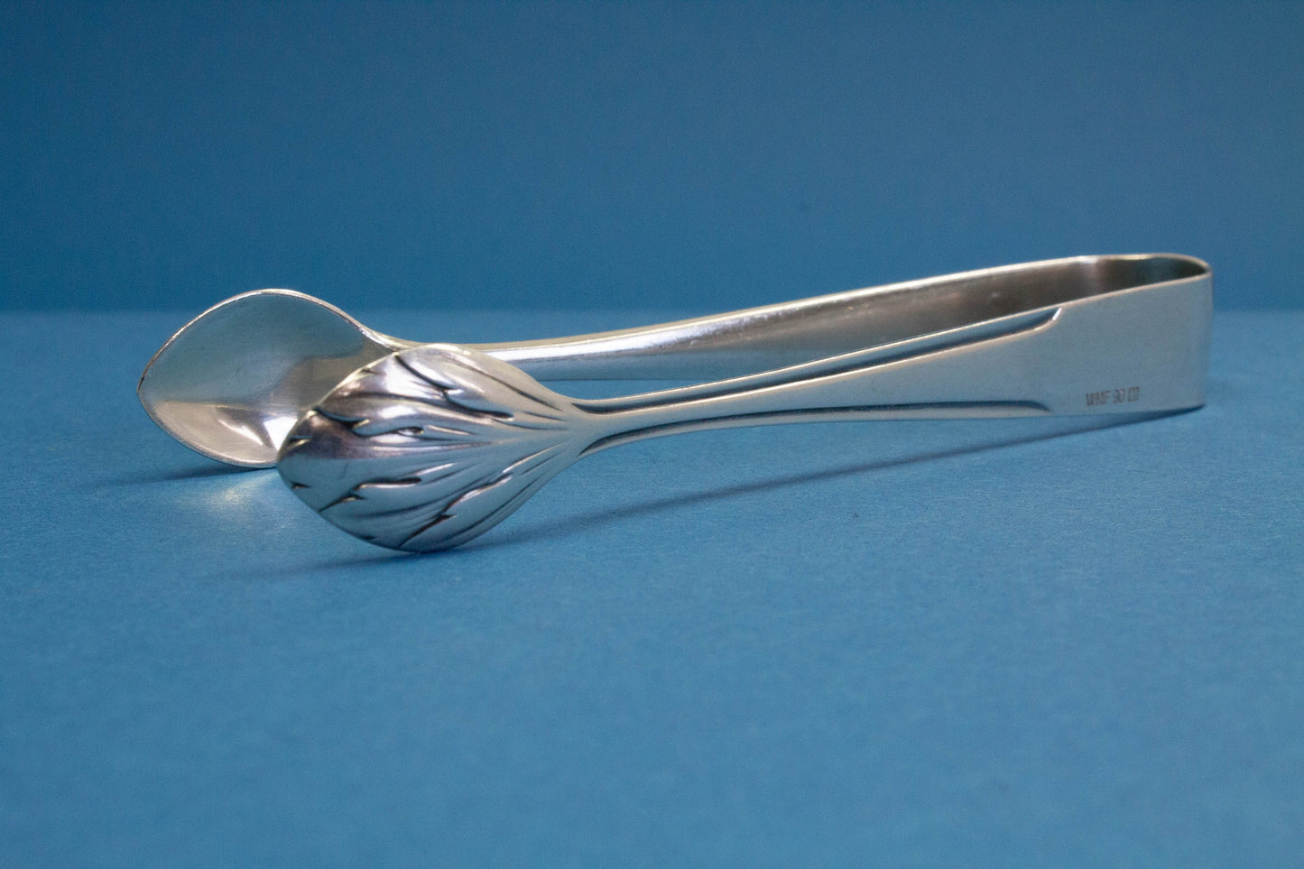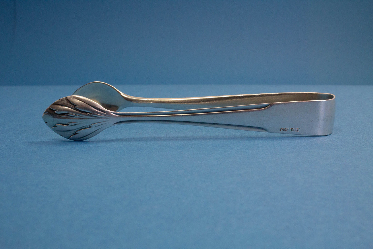 Une pince à sucre en métal argenté de WMF au motif 1600 acanthe pour un plaisir de thé particulier.