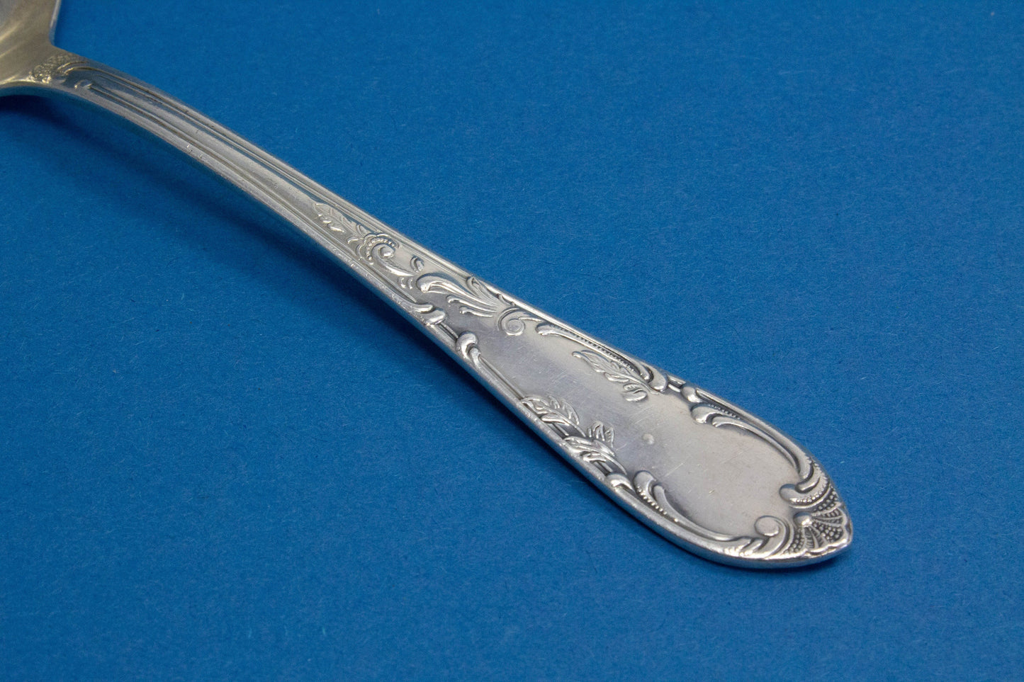 Une grande cuillère à crème en métal argenté avec de très jolis décors rococo. La cuillère a un bol en forme de coquillage et est idéale pour servir de la crème ou d'autres desserts.