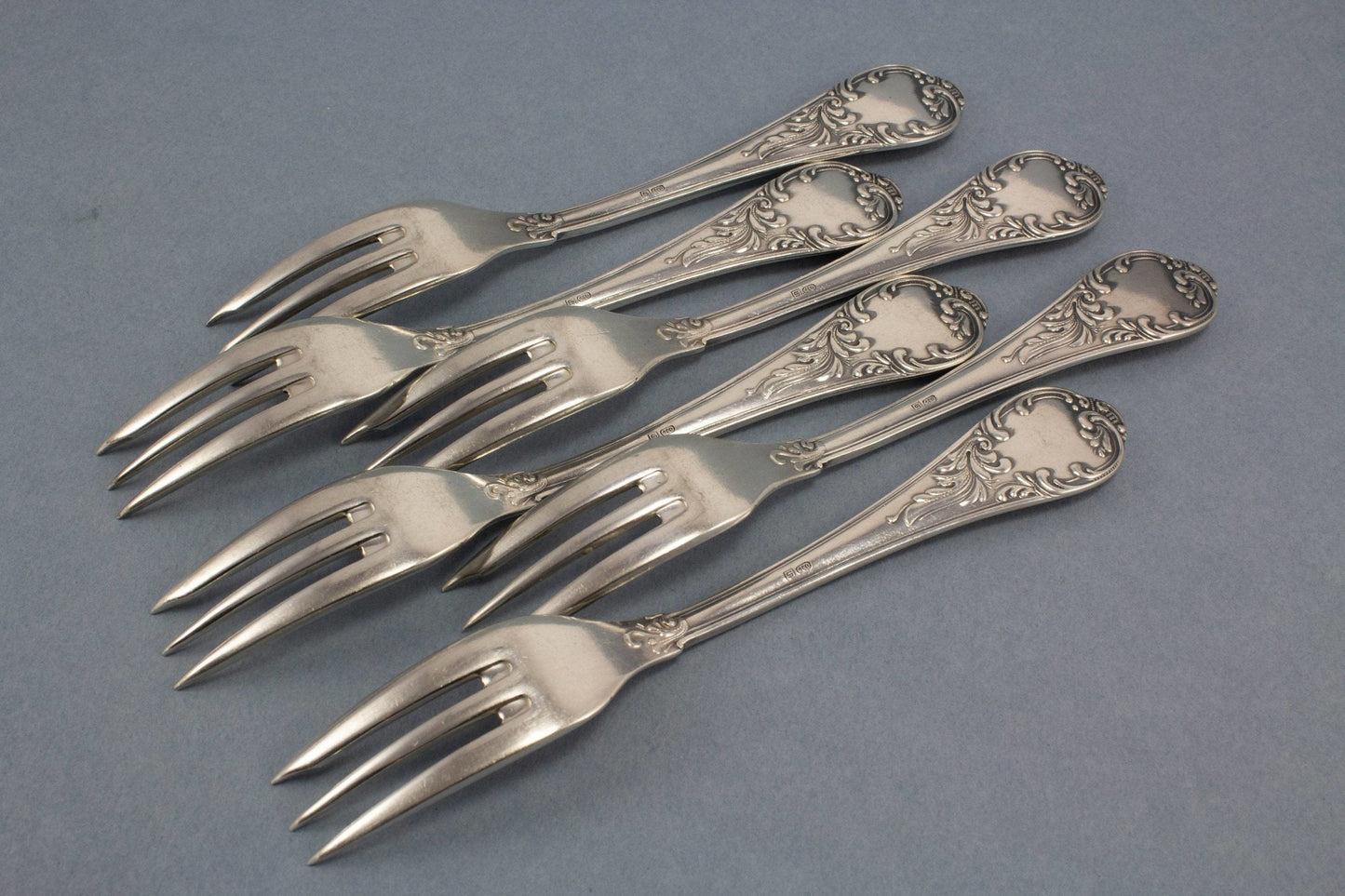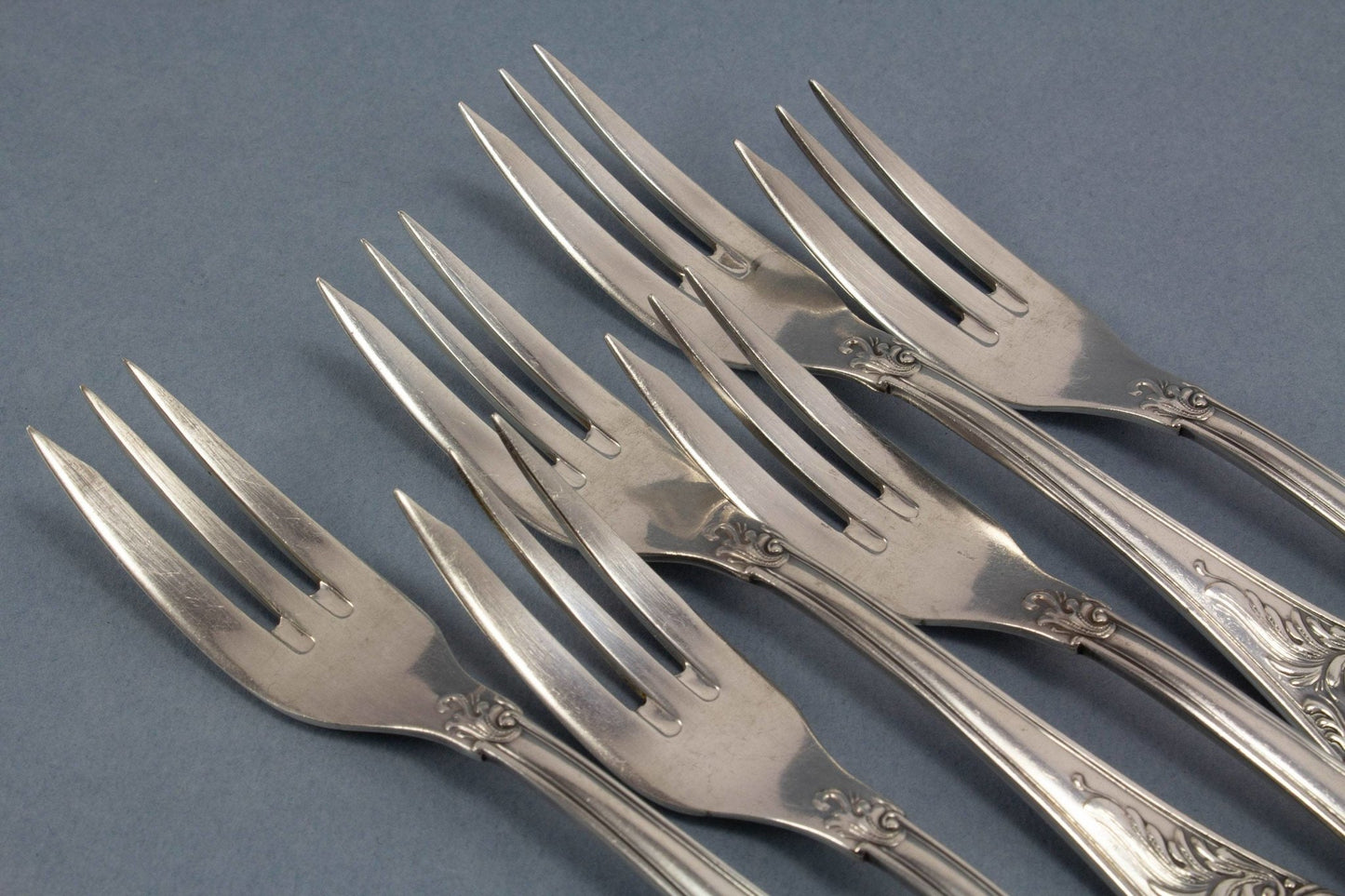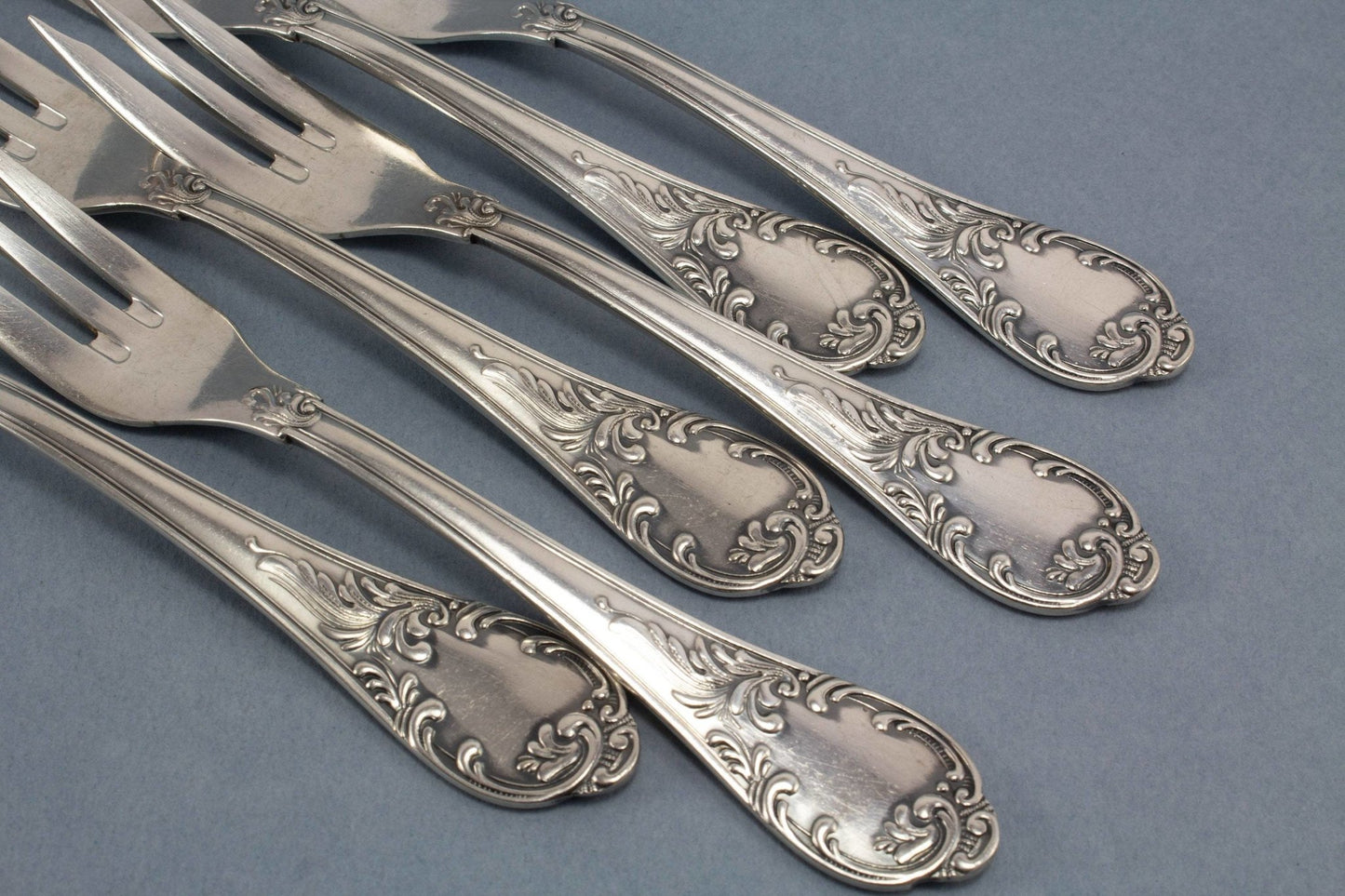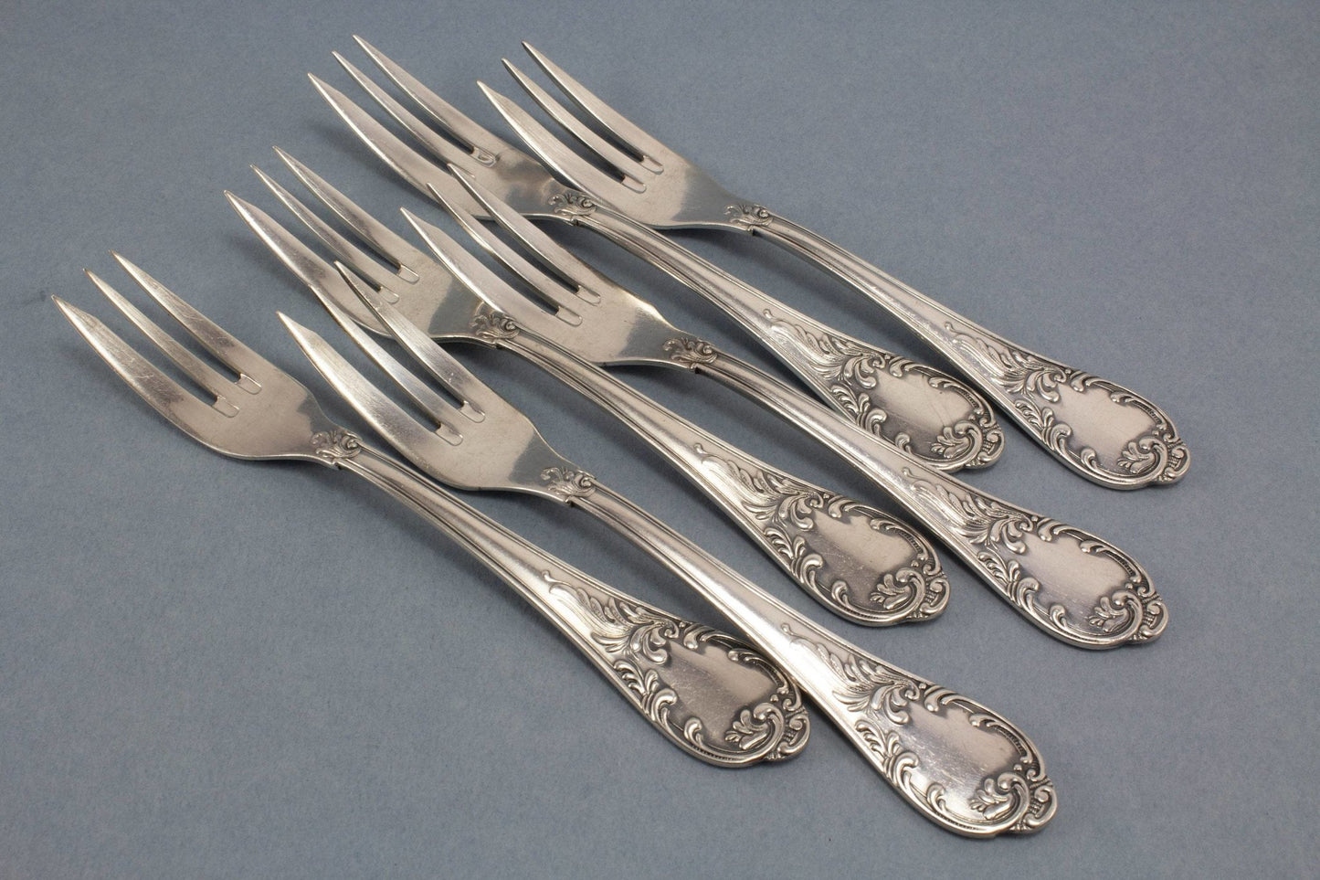ロココ様式の6つの銀メッキケーキフォーク。特別な瞬間のための美しいフォーク。