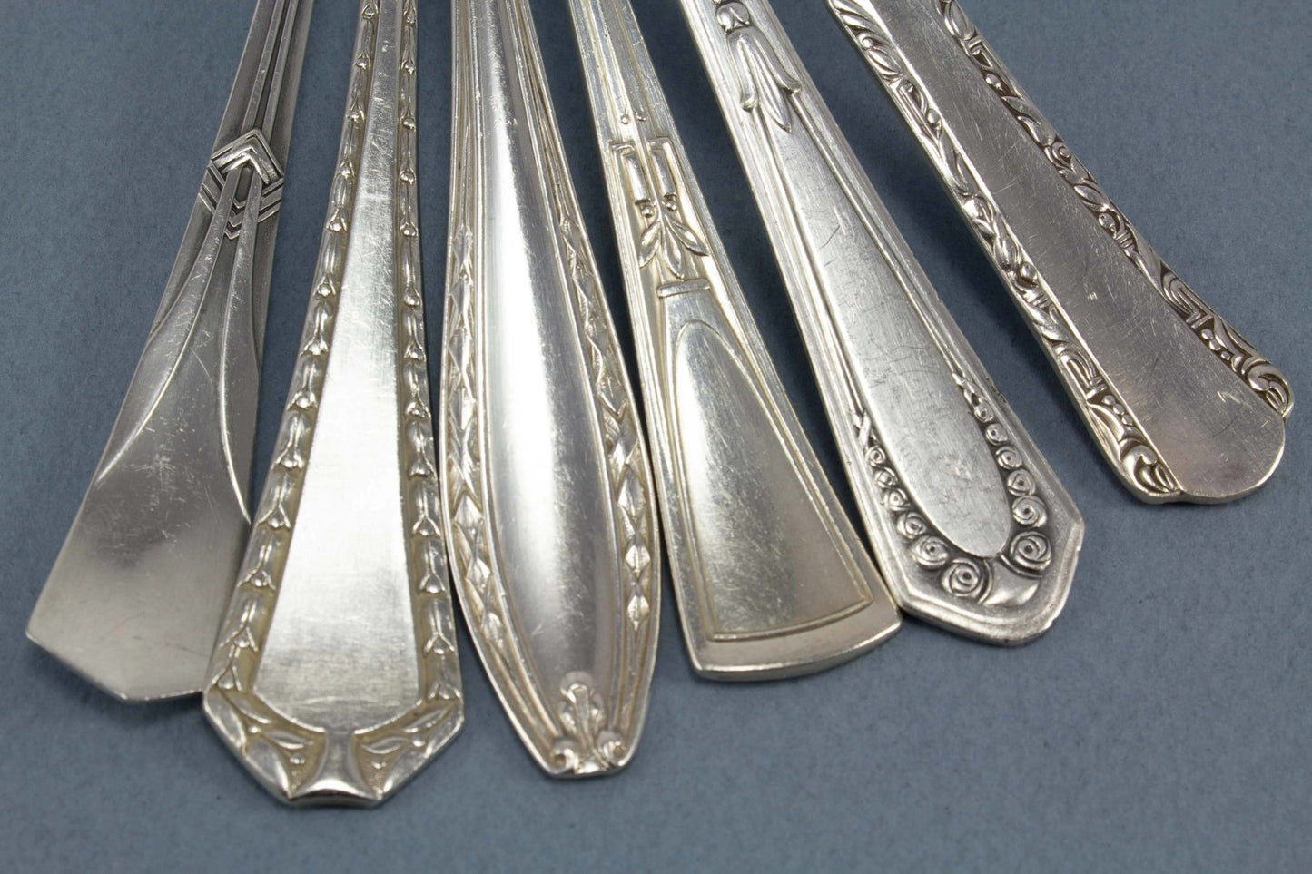 アールヌーボーとアールデコの異なる印象的な装飾が施された6つのアンティークと銀メッキのヴィンテージティースプーン。