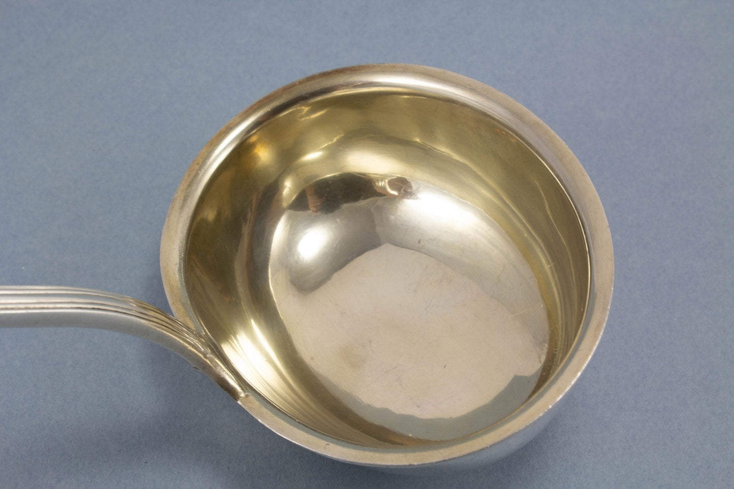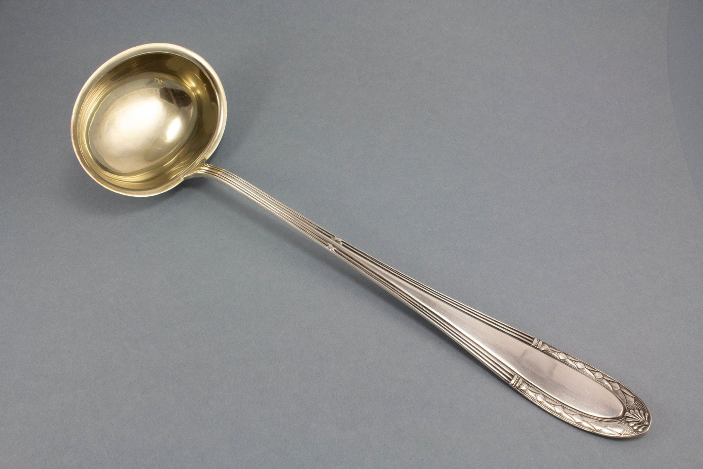 この美しい銀メッキのスープレードルGAGは、アールヌーボーのパターンを示しています。