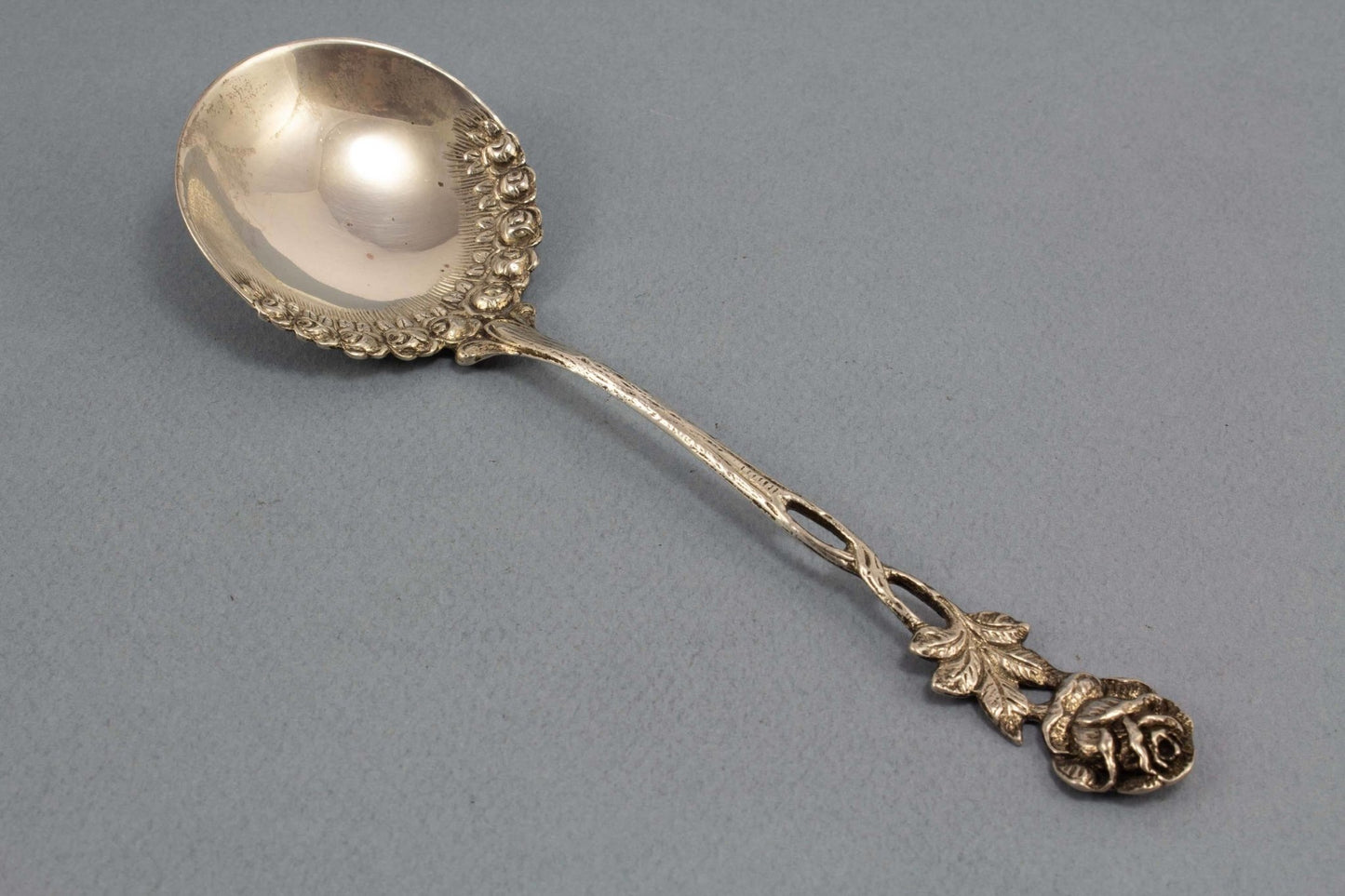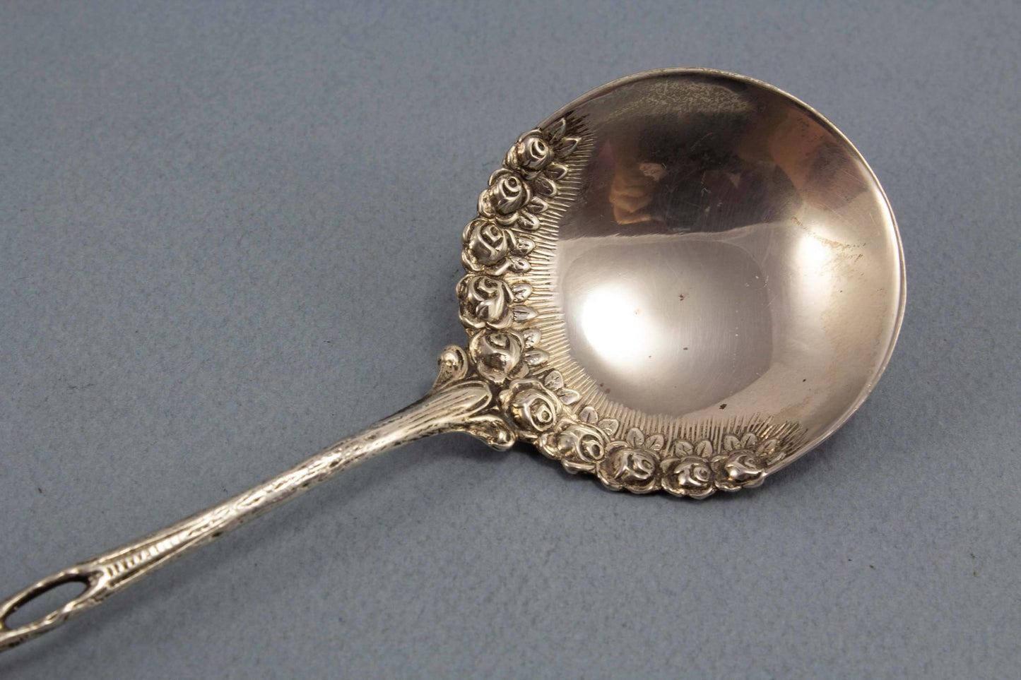 非常に繊細なヒルデスハイムのバラの装飾が施された銀製の大きなクリームスプーン。手の込んだ装飾は、ハンドルとスプーンにもあります。クリームスプーンは800シルバー製です。非常に特別な機会のための美しいヴィンテージ作品。
