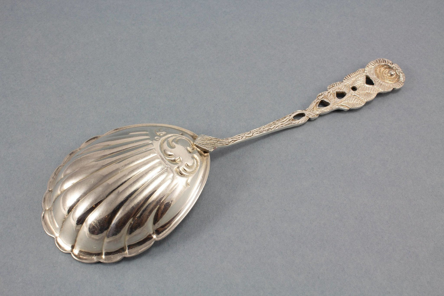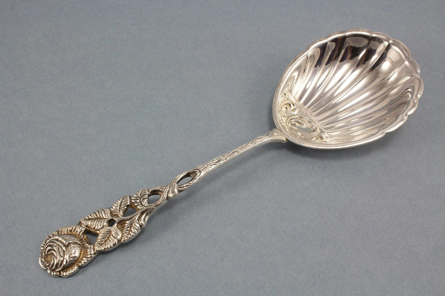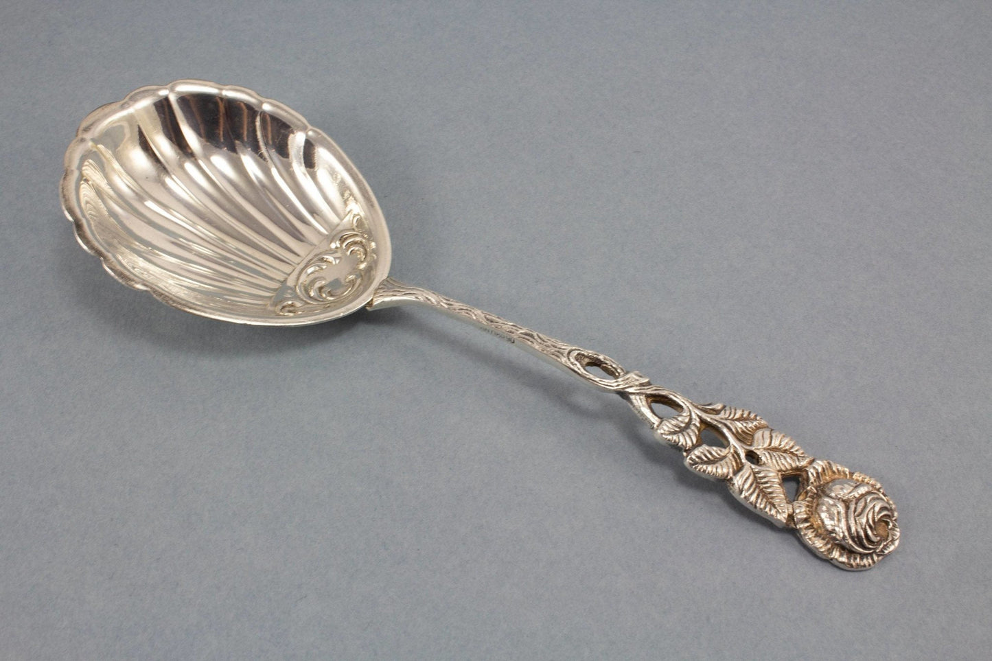 ハンドルに有名なヒルデスハイムローズのデザインが施されたヴィンテージのクリームスプーン。スプーンは殻のような形をしています。