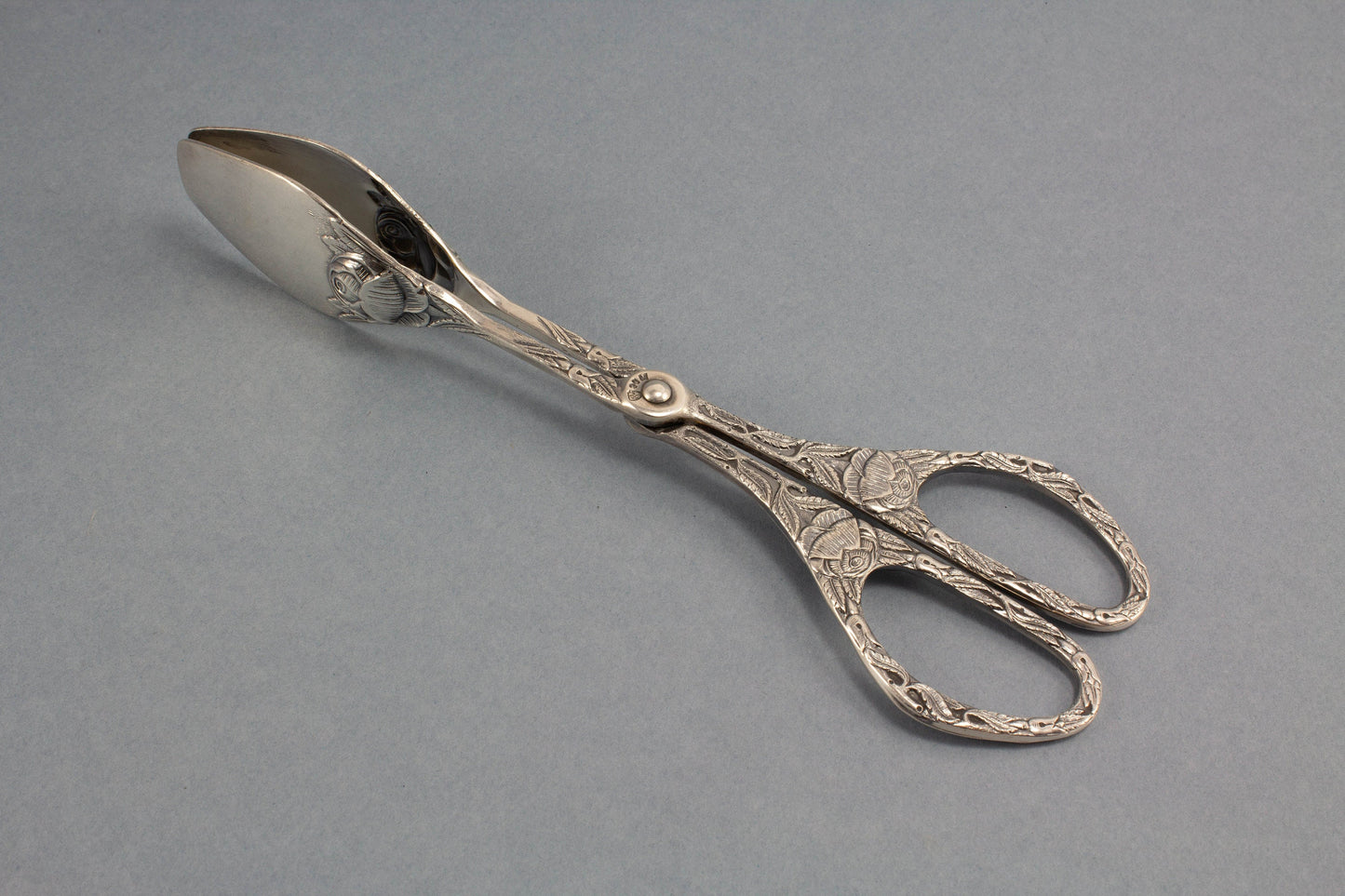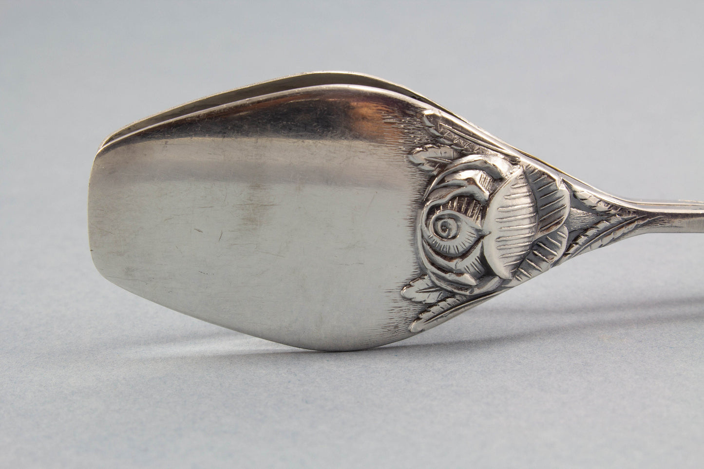バラの模様が入った銀メッキのペストリートングは、コーヒーテーブルで目を引くアイテムです。