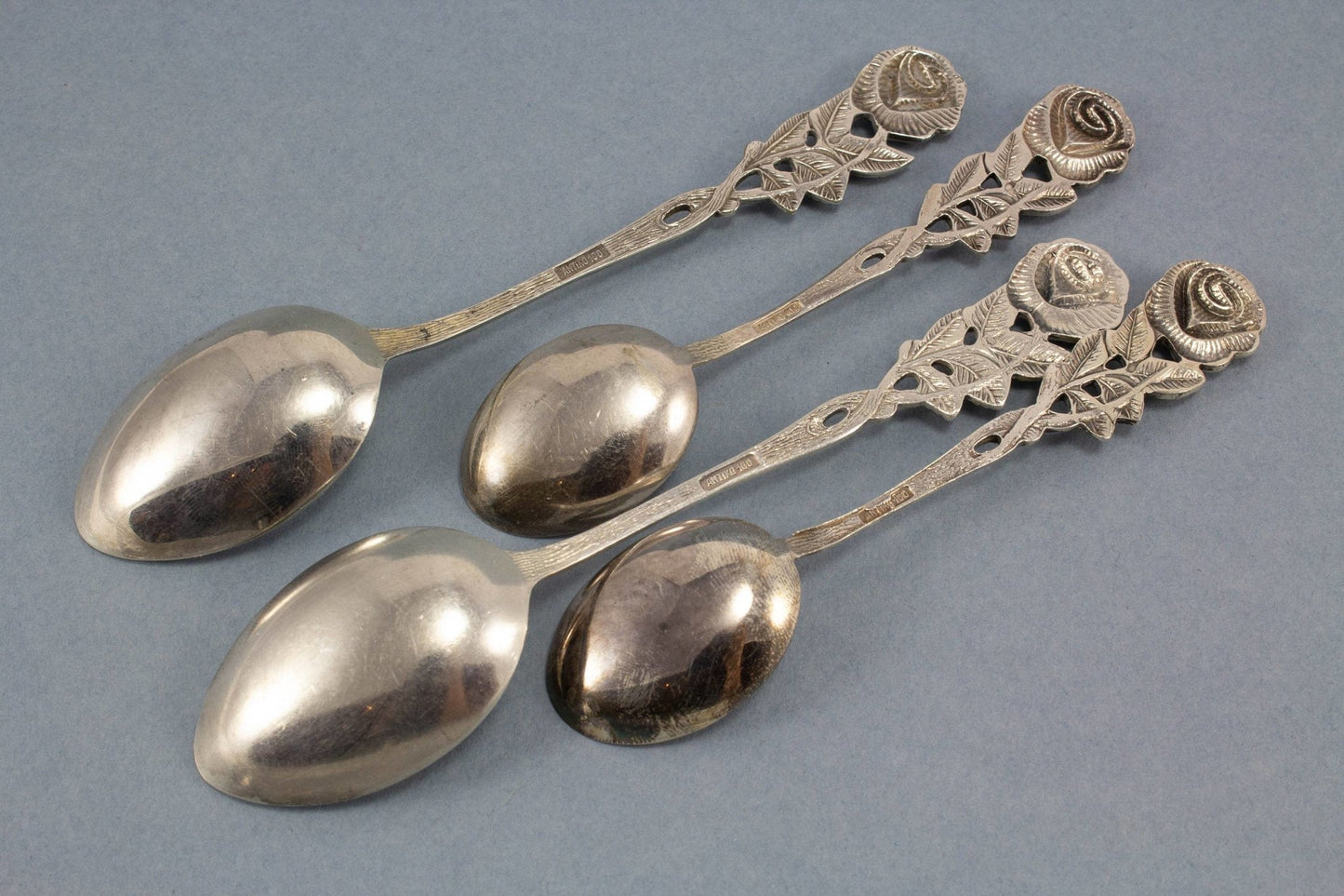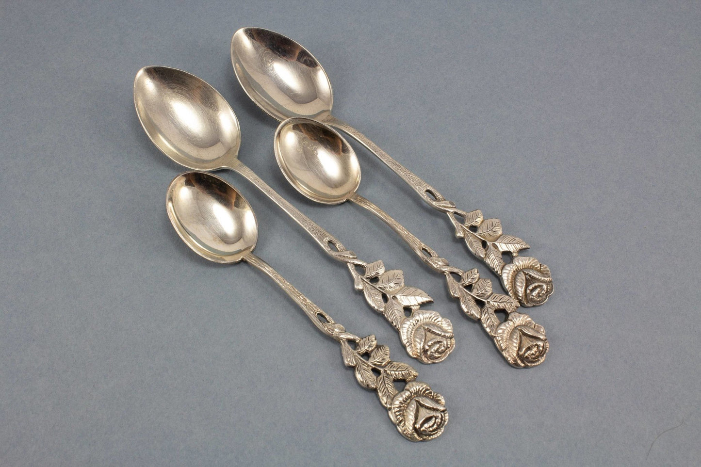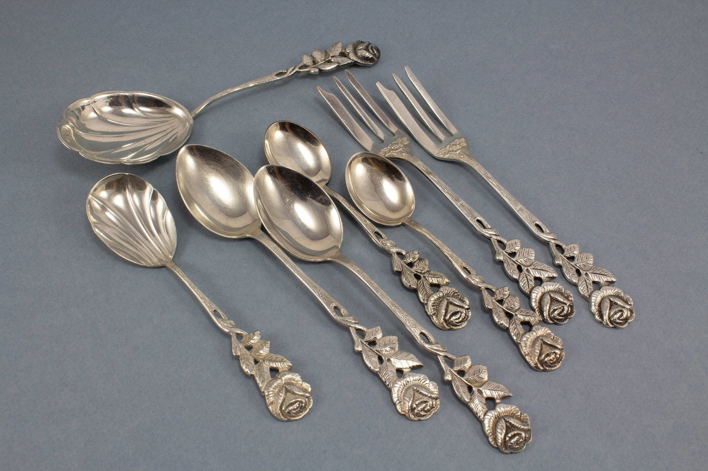 2本のバラがセットされた素敵なカトラリー、銀メッキ、クリームスプーン、シュガースプーン、小さじ