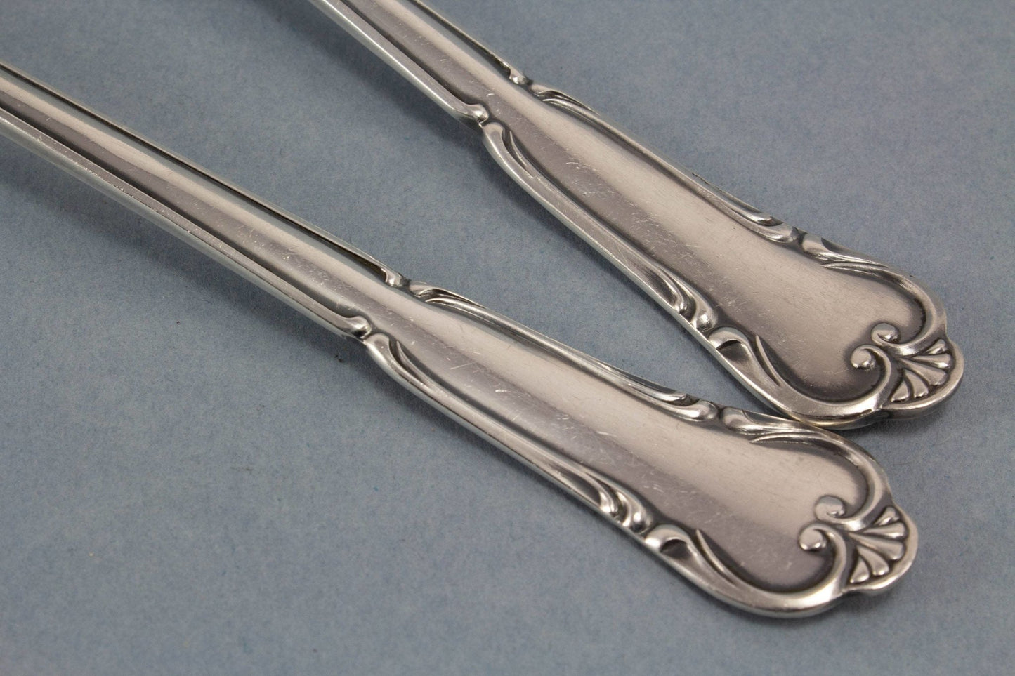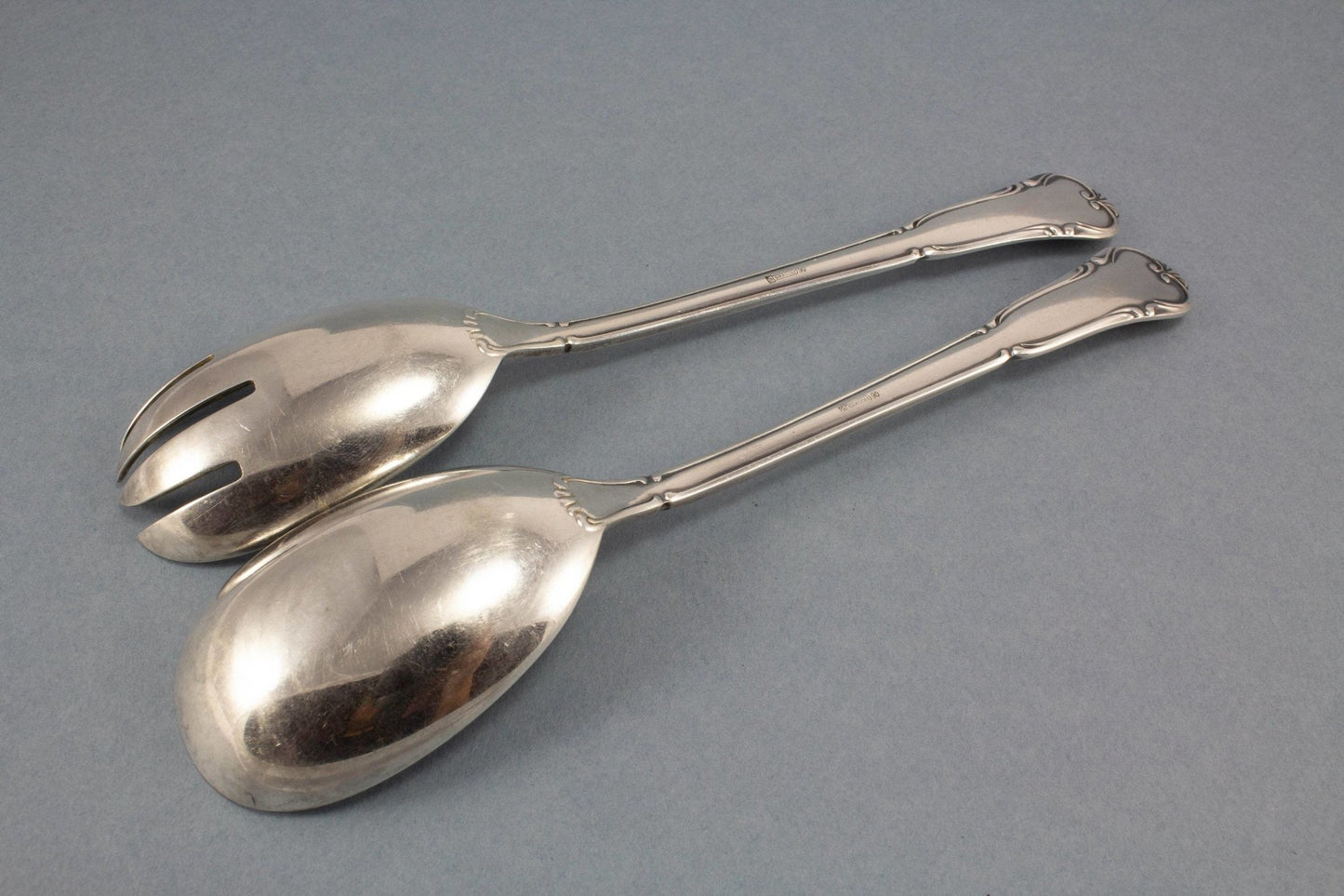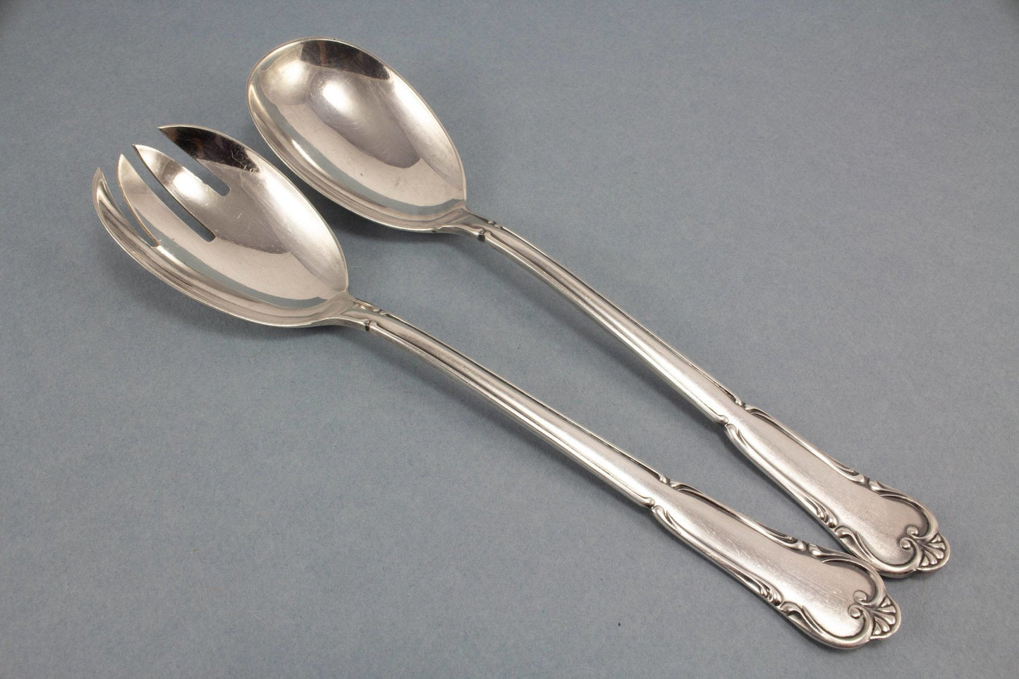 素敵な銀メッキのサラダサーバー。両方のカトラリーは同じパターンを示し、美しいダイニングテーブルで非常にエレガントに見えます。おいしいサラダを食べるときのさらなる喜びのための素晴らしいサービングカトラリー。