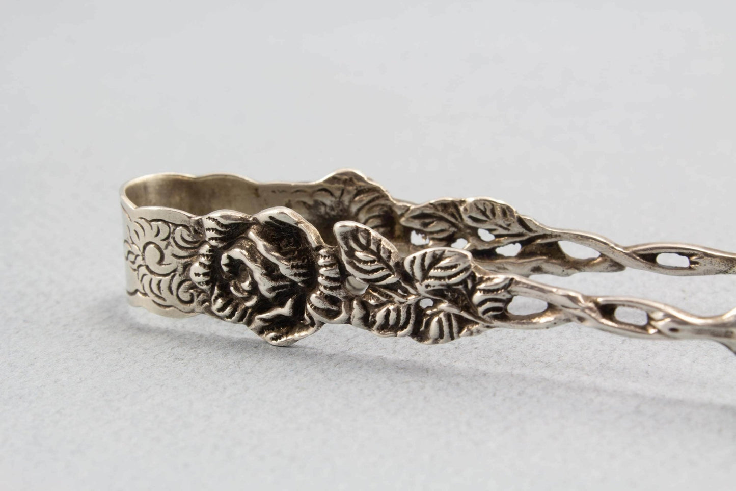 人気のバラ柄の美しいシルバーシュガートング。爪はバラの花びらの形をしています。小さなペンチは、精巧に作られたバラを示しており、両側にブレークスルーがあります。砂糖トングは、キャンディーや角砂糖をカップに入れるのに欠かせないヘルパーです。ティータイムにぴったりのアンティークトング。 835シルバーで作られたこの小さいながらも上質なヴィンテージ作品で楽しい時間を過ごし、お茶の時間をお楽しみください。