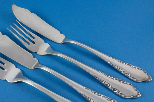 Robbe and Berking의 생선 커틀러리, 동 프리지아 패턴의 4인용 은도금 피시 포크와 피쉬 나이프