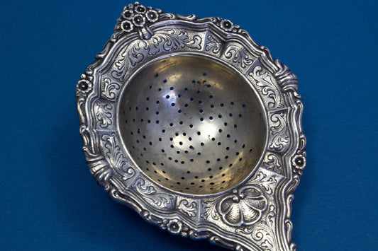 1900년 800실버로 만든 특별한 로코코 장식이 있는 앤티크 차 여과기