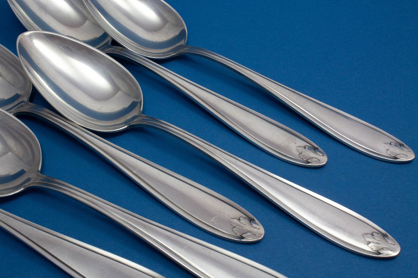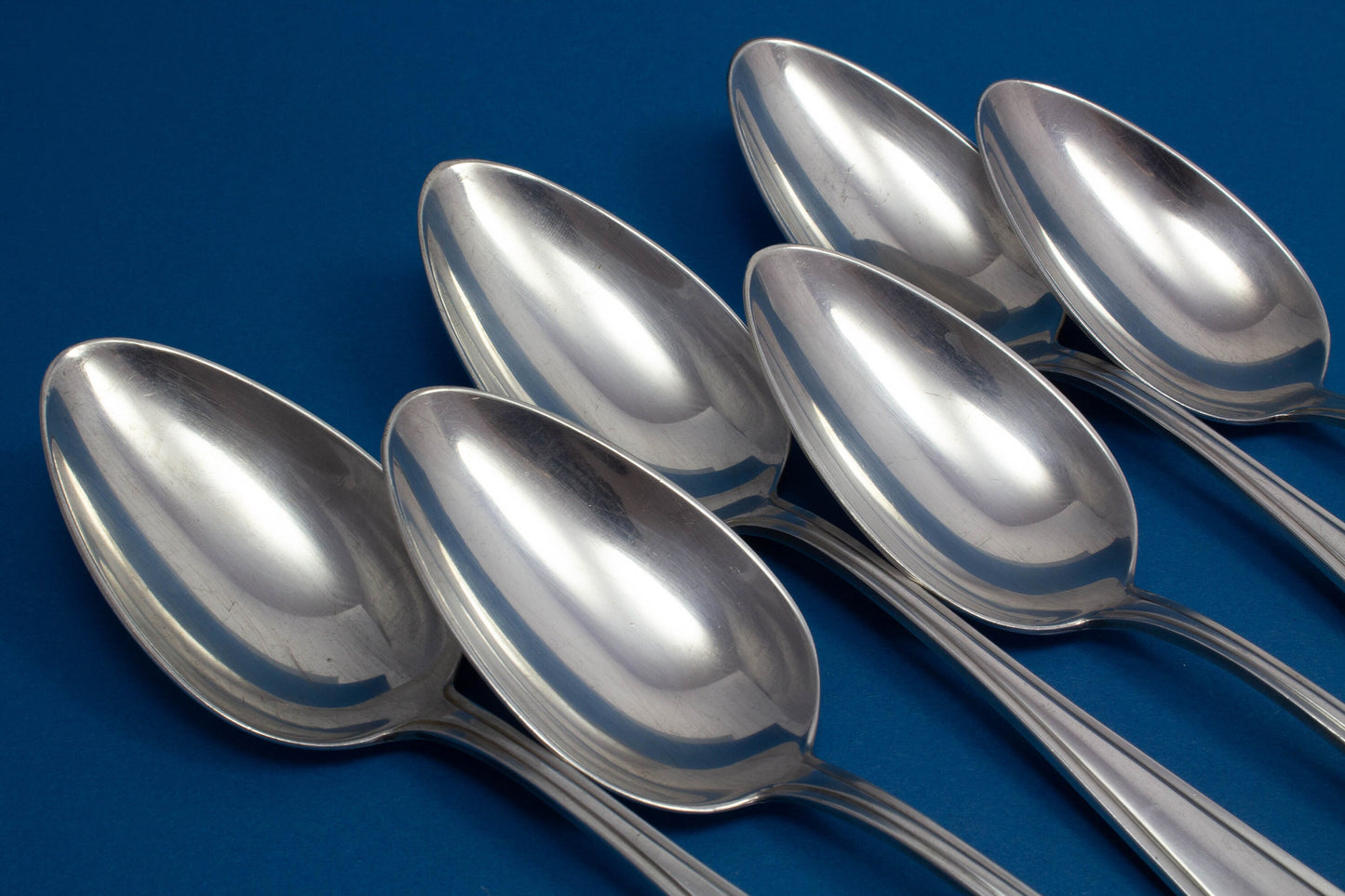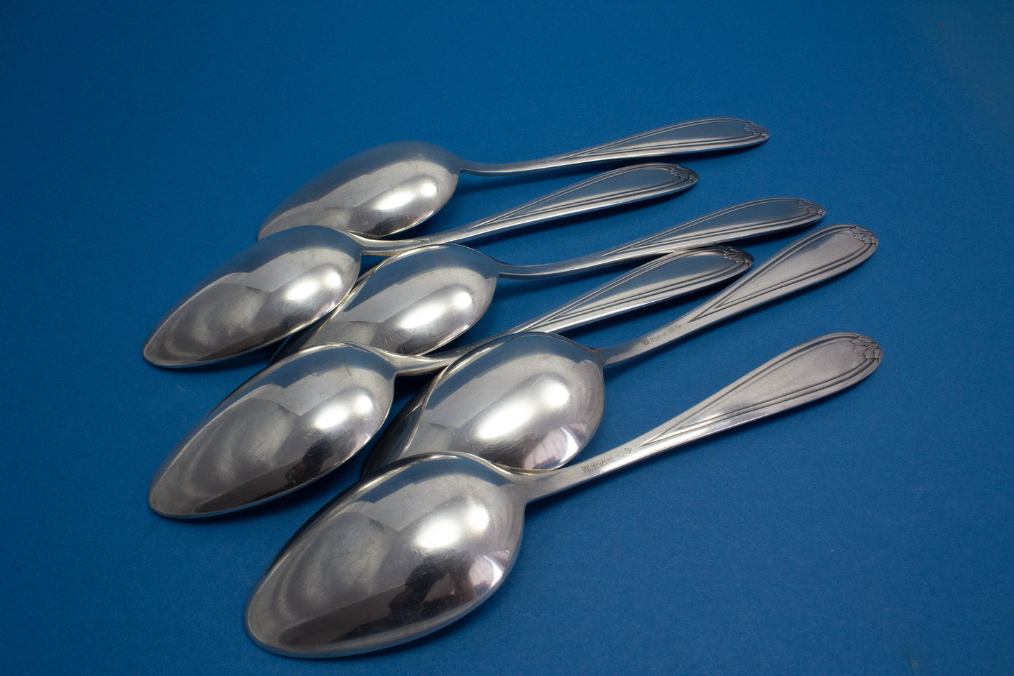 WMF의 아름다운 테이블 스푼 6개는 은도금입니다. 빈티지 스푼은 아칸서스 잎이 있는 아름다운 아르누보 장식으로 꾸며져 있습니다.
