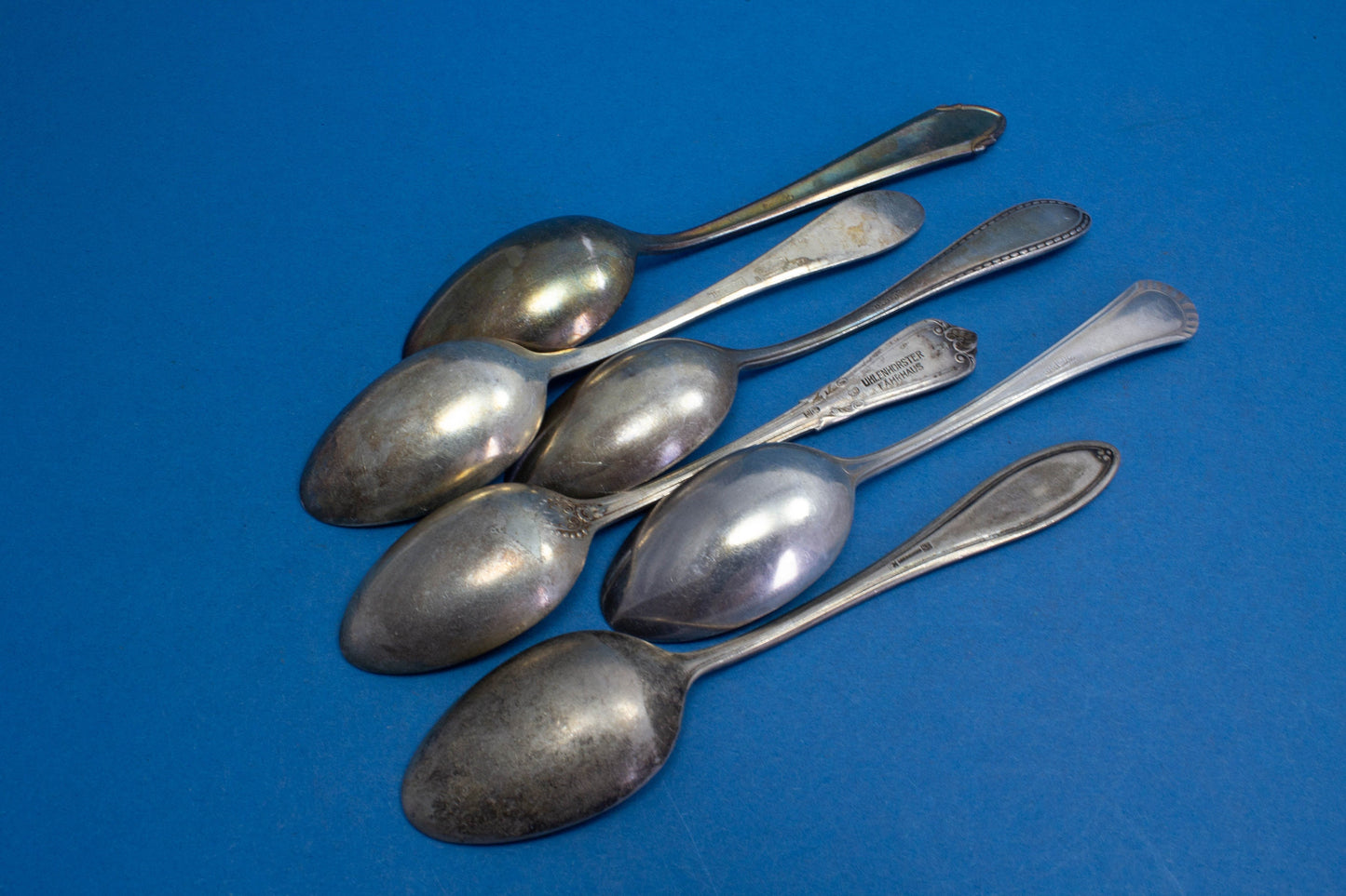 다양한 인상적인 아르누보, 아르데코 및 로코코 장식이 있는 6개의 골동품 및 은도금 빈티지 스푼.