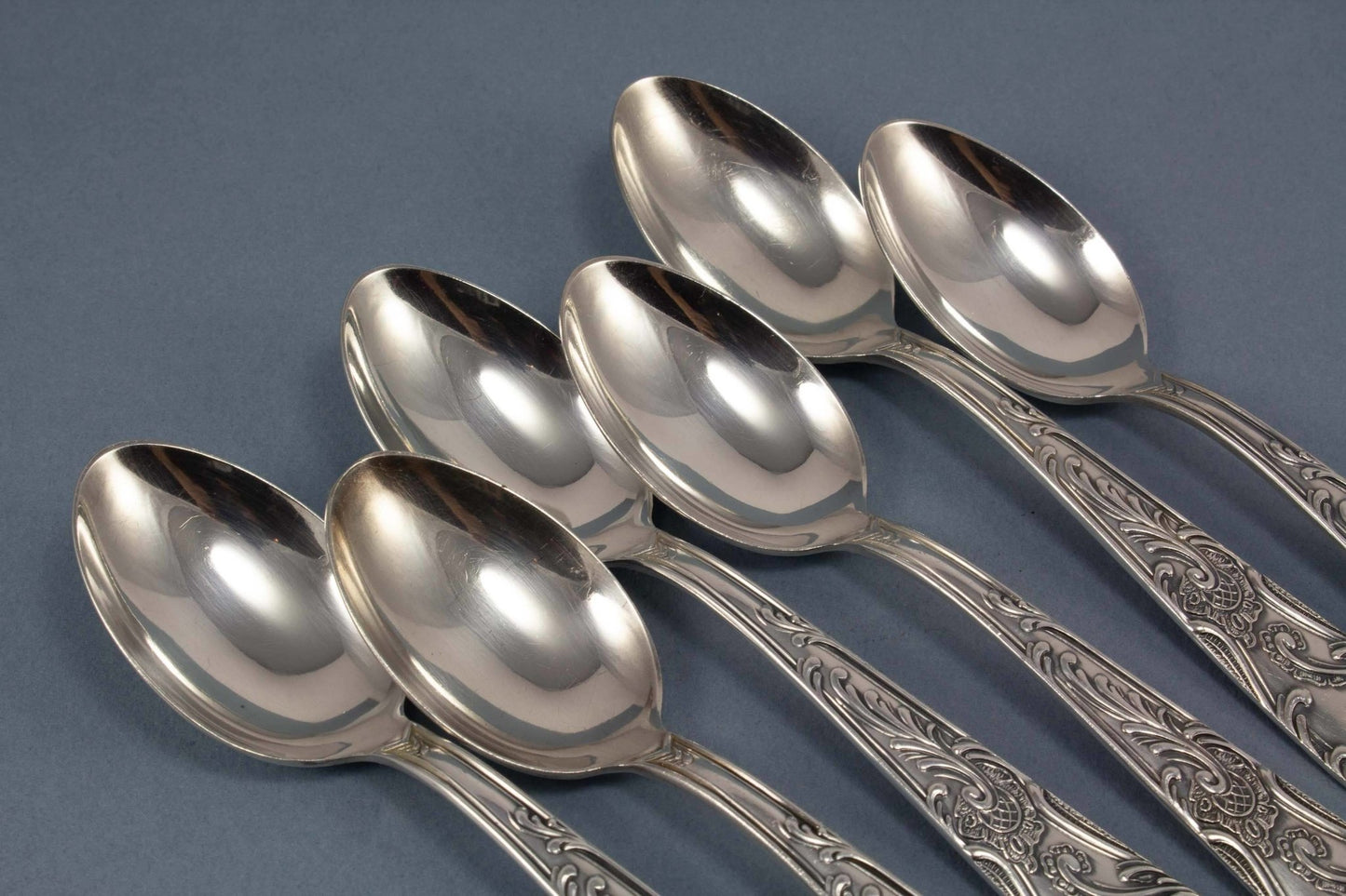 일치하는 설탕 숟가락과 함께 이 6개의 아름다운 찻숟가락은 은도금되어 있습니다. 장식된 모든 커피 테이블을 보고 사용할 수 있는 고급 빈티지 스푼.