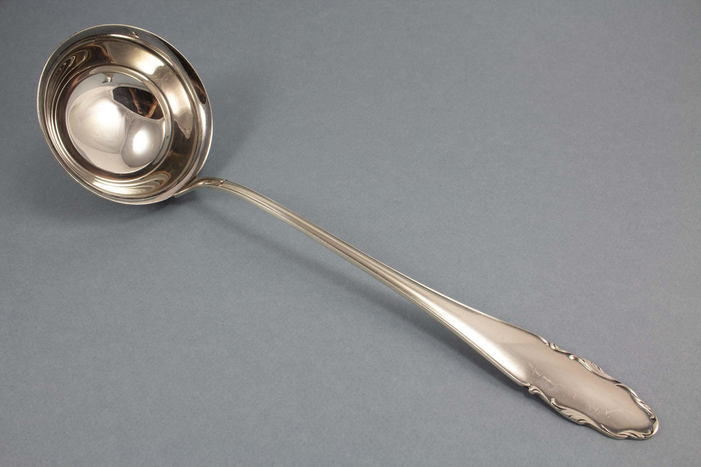 WMF의 이 아름다운 은도금 수프 국자는 아름다운 장식 2200을 보여줍니다.