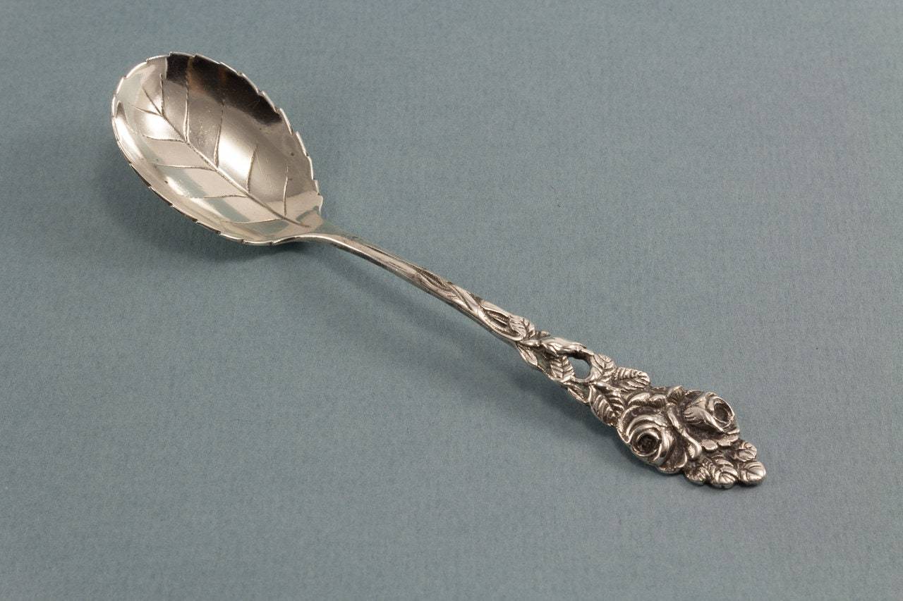정교하게 세공된 힐데스하임 장미 장식이 있는 은으로 만든 작은 설탕 숟가락. 숟가락은 장미 꽃잎 모양입니다. 설탕 스푼은 800실버로 만들어졌습니다. 아주 특별한 날을 위한 아르누보 시대의 아름다운 빈티지 작품.