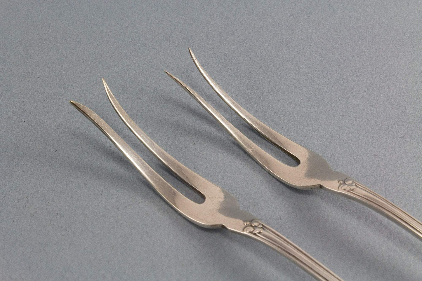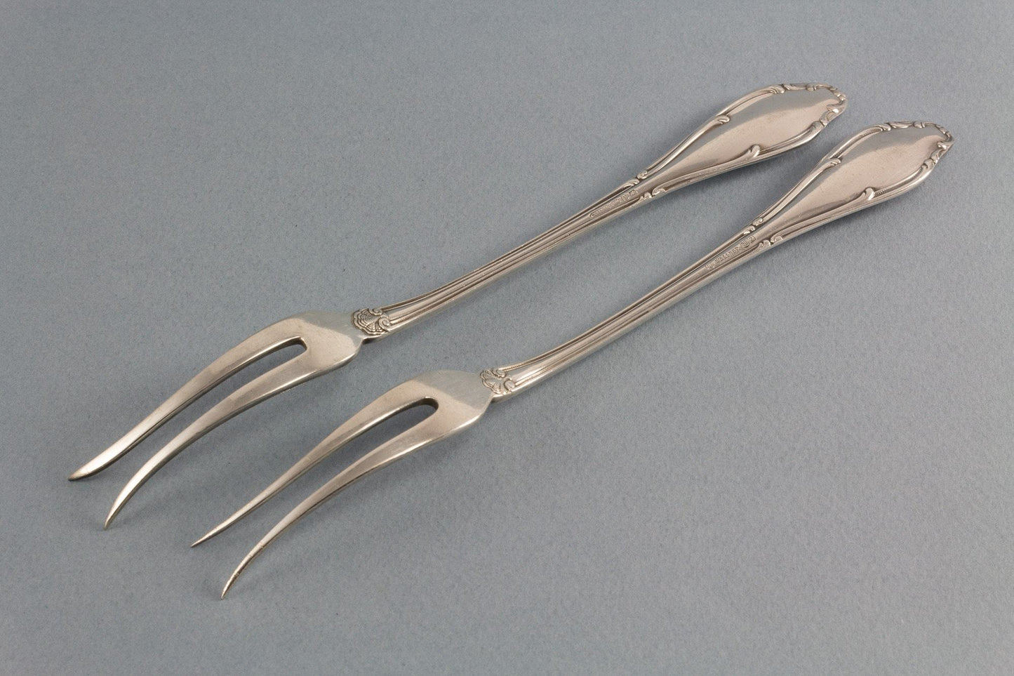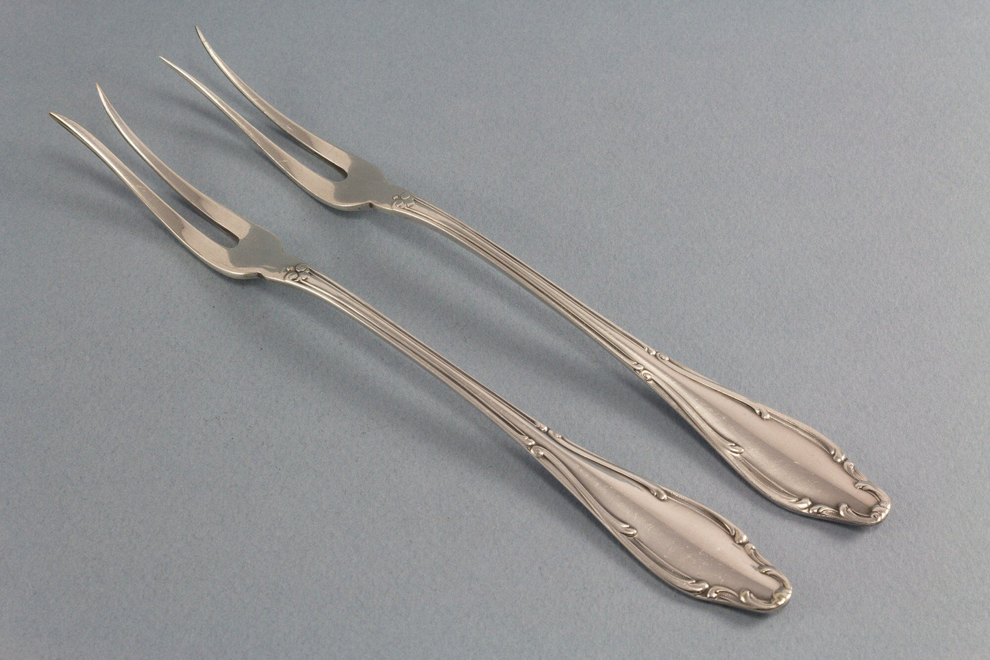 Zwei sehr hübsche Fleischgabeln von Wellner, Modell Mozart. Die beiden Gabeln sind versilbert.