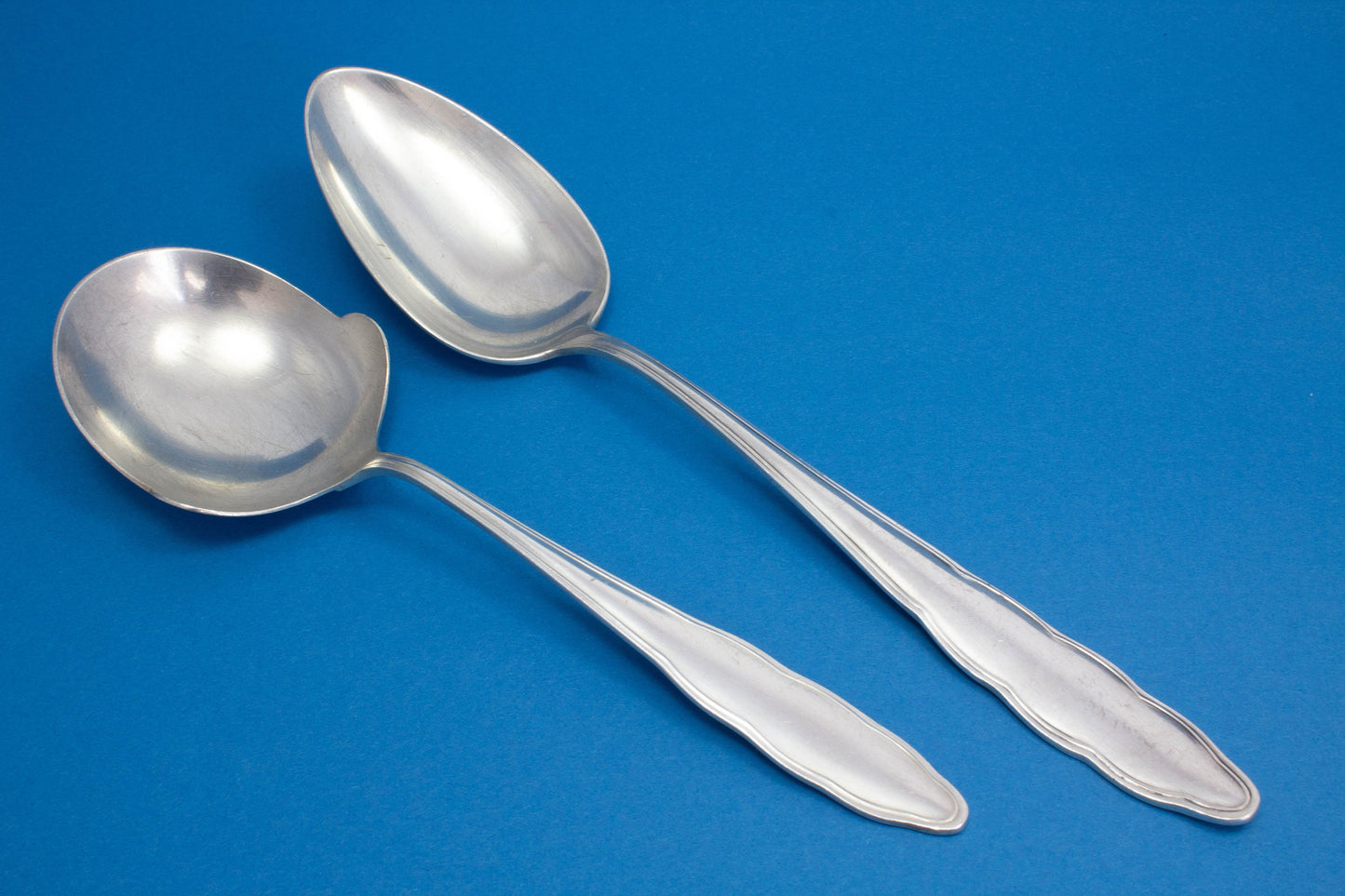 Ein großer, versilberter Gemüselöffel mit dem passenden Kartoffellöffel aus der Chippendale-Serie von WMF.