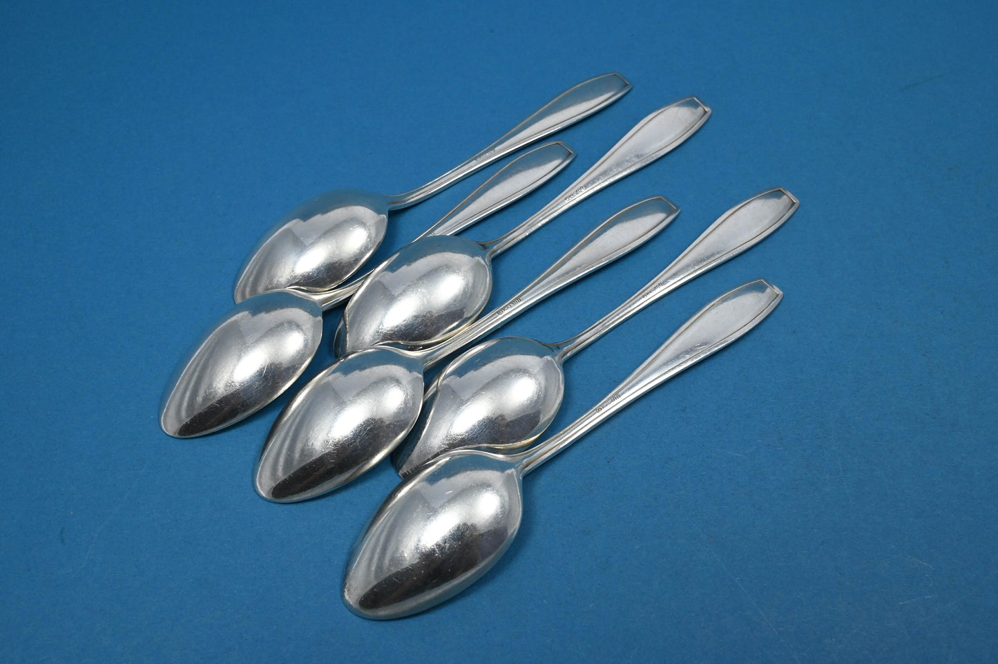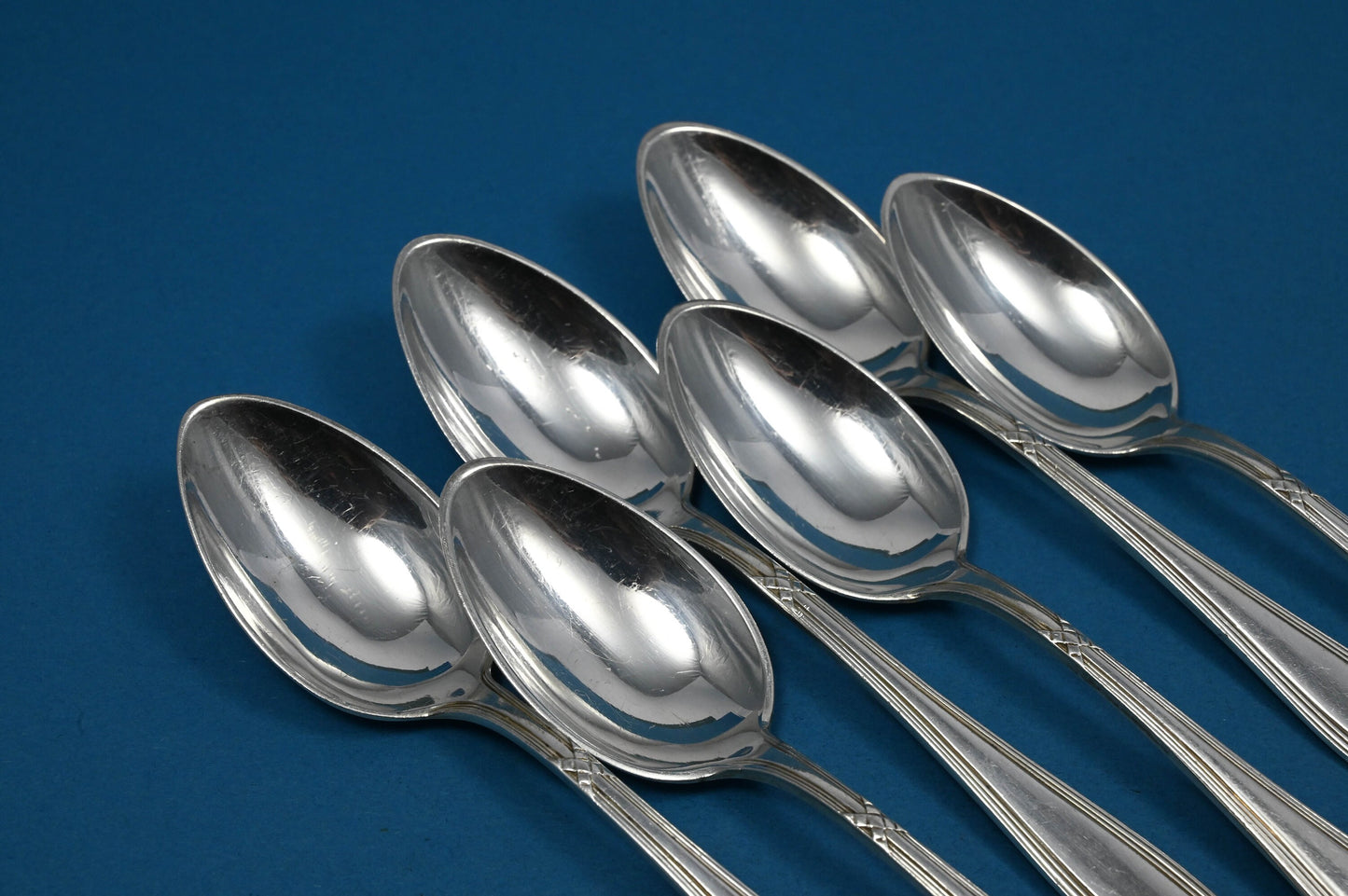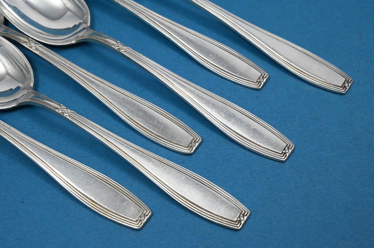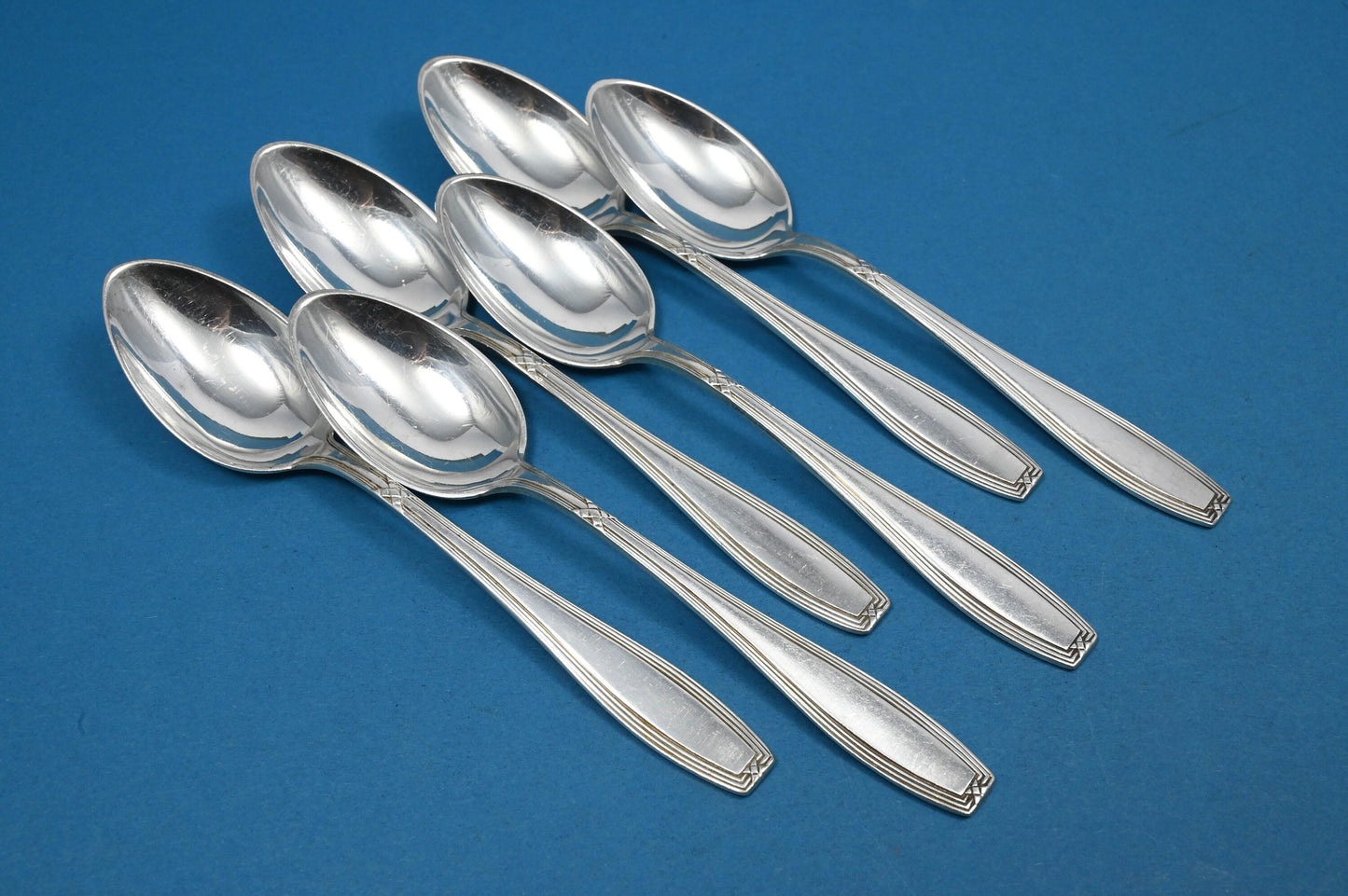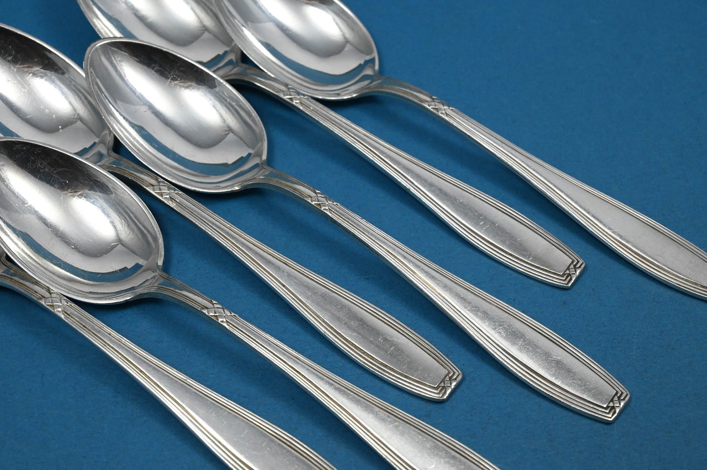 Sechs seltene Teelöffel der Besteckmanufaktur OKA im schönen Kreuzband-Muster. Hübsche Teelöffel und ein toller Blickfang neben Ihrer Kaffeetasse bei einer Tafel mit Leckereien im Kreise Ihrer Lieben.