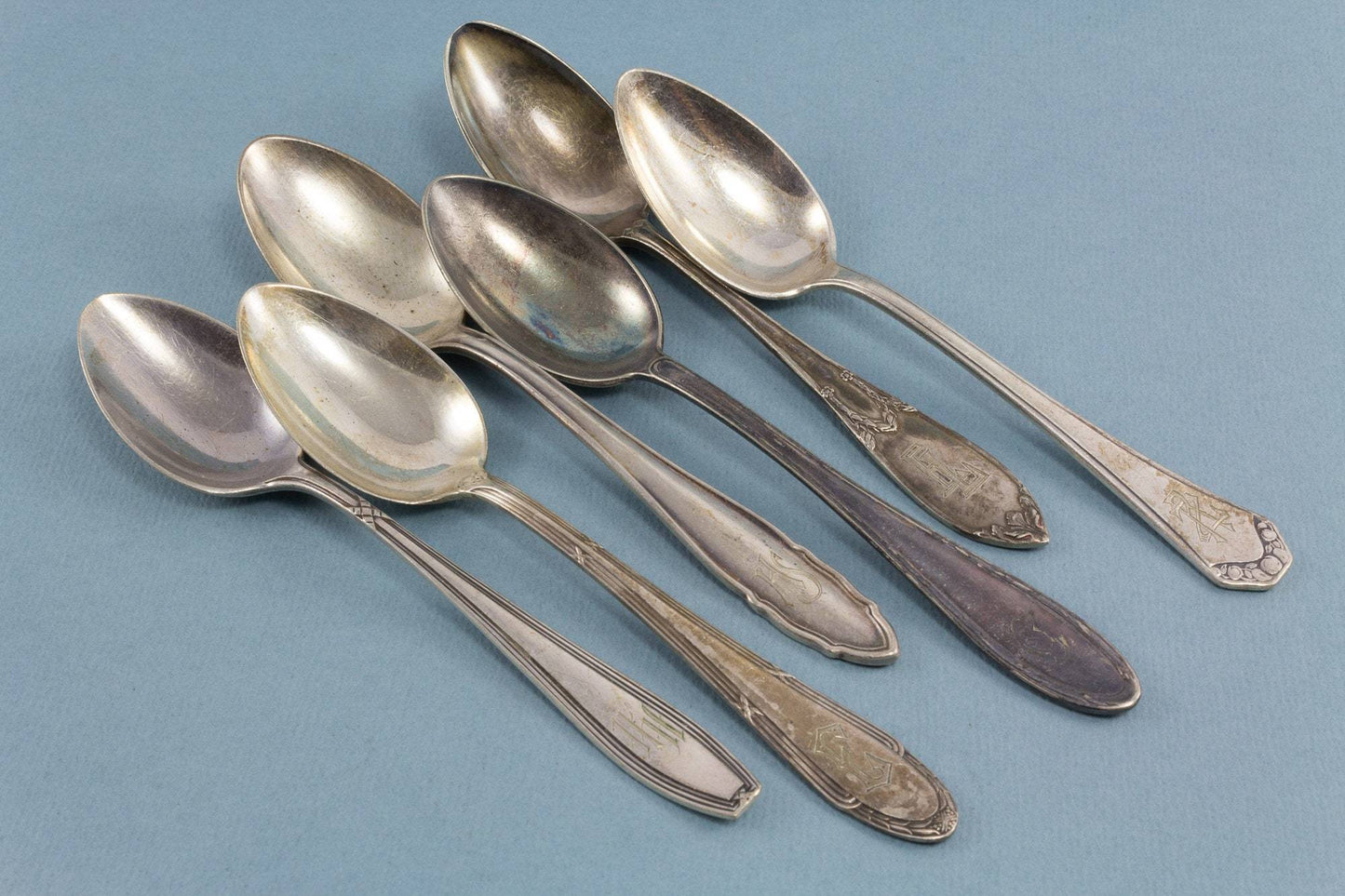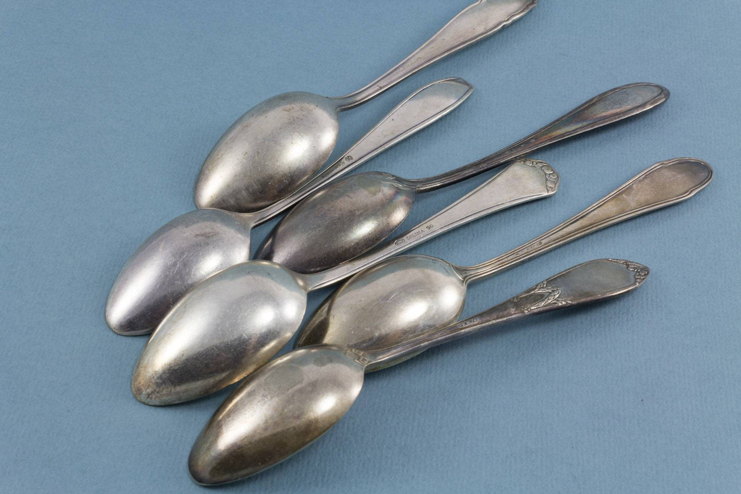 6 antike Teelöffel mit Gravuren, versilberte Löffel im Jugendstil, Mismatched