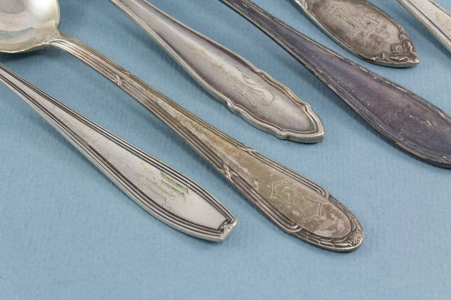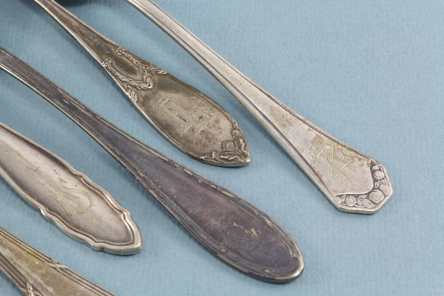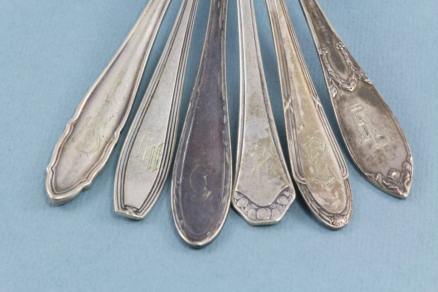 Sechs antike und versilberte Teelöffel mit verschiedenen, eindrucksvollen Dekoren des Jugendstils. Alle Löffel sind wunderschön mit Initialen graviert. Außergewöhnliche, uralte Löffel mit Charakter und teilweise ebenso alter Patina in verschiedenen Silberauflagen.