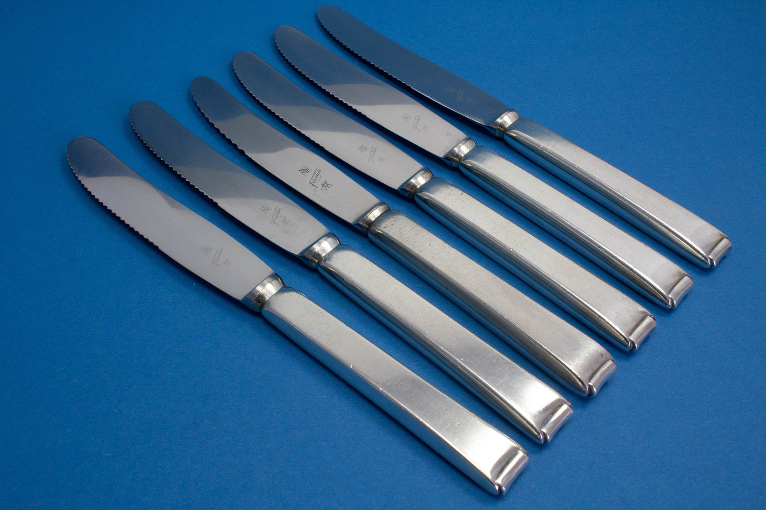 Diese sechs schönen Dessertmesser im beliebten Art Deco WMF 2500 Muster sind versilbert und kommen von WMF.