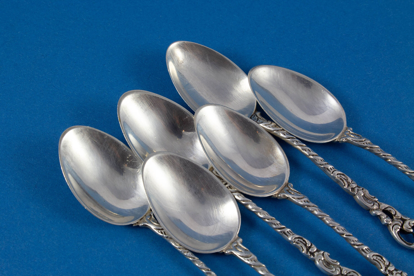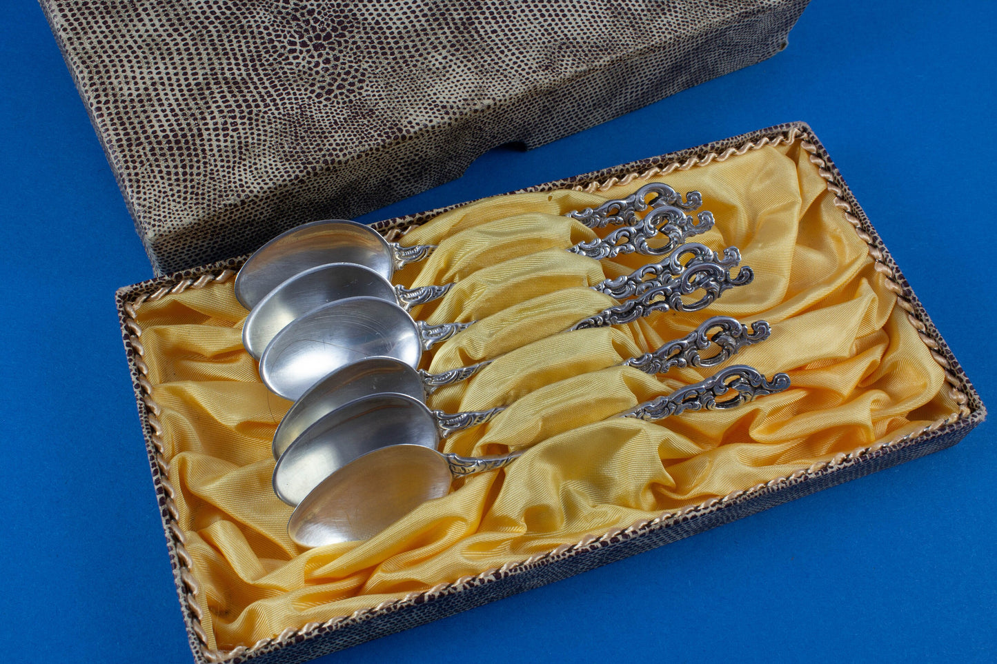 6 Löffel für Mokka 800er, Espressolöffel mit Rokokomuster