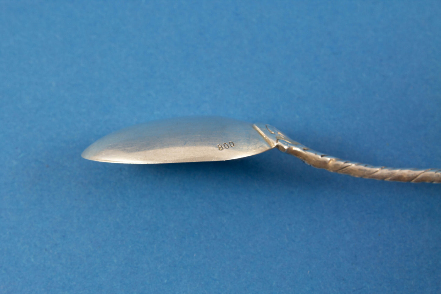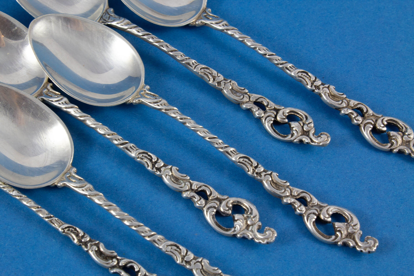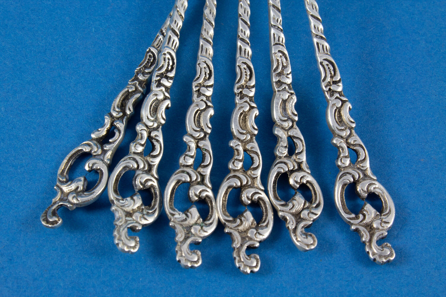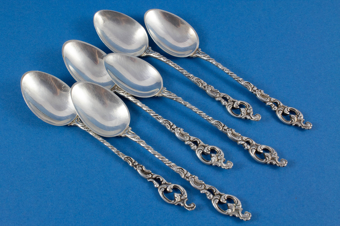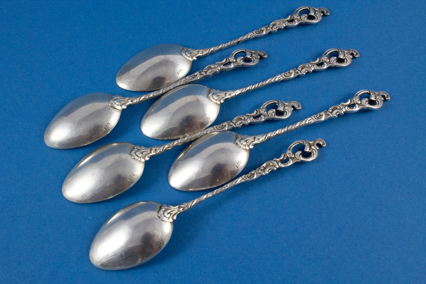 Sechs kleine Mokkalöffel oder Espressolöffel aus 800er Silber mit einem hübschen Rokoko-Muster.