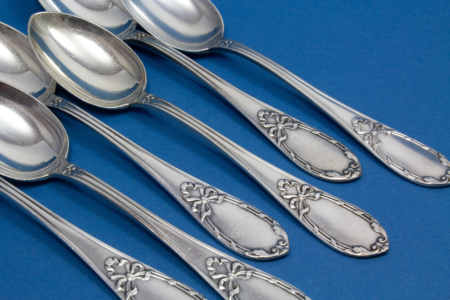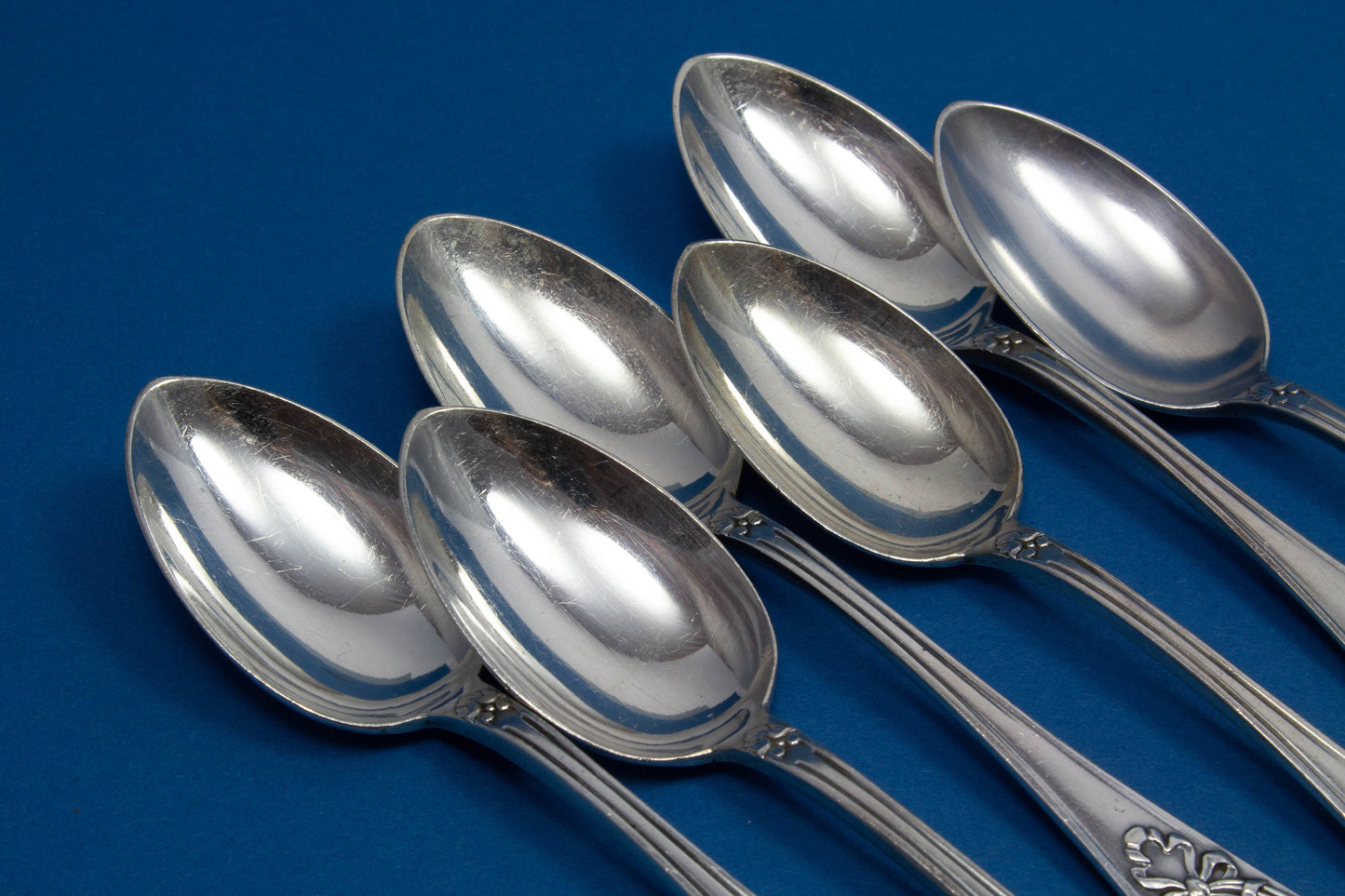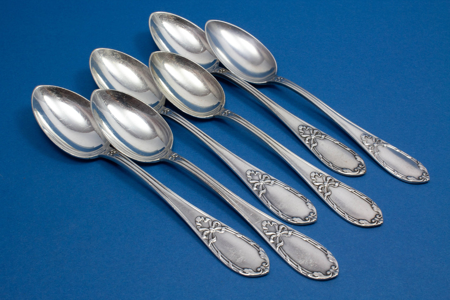 Sechs seltene Teelöffel von der Besteckmanufaktur VSF im Schleifen-Muster.