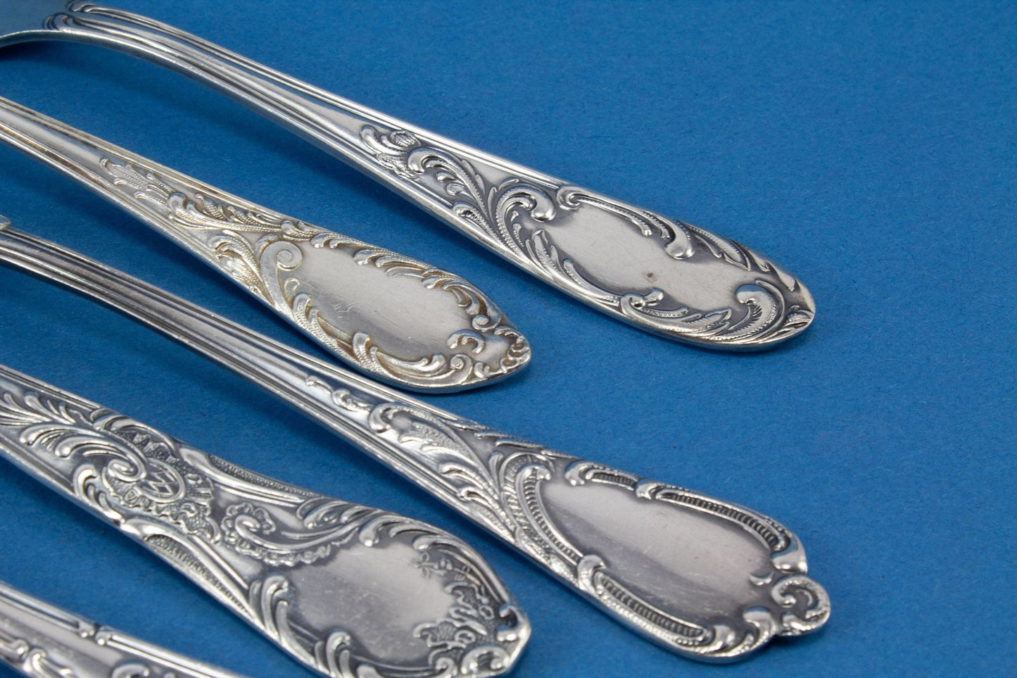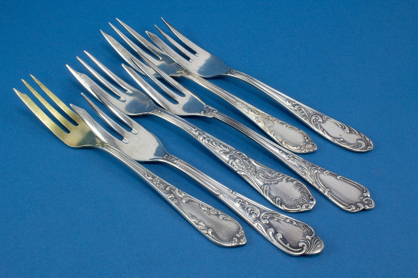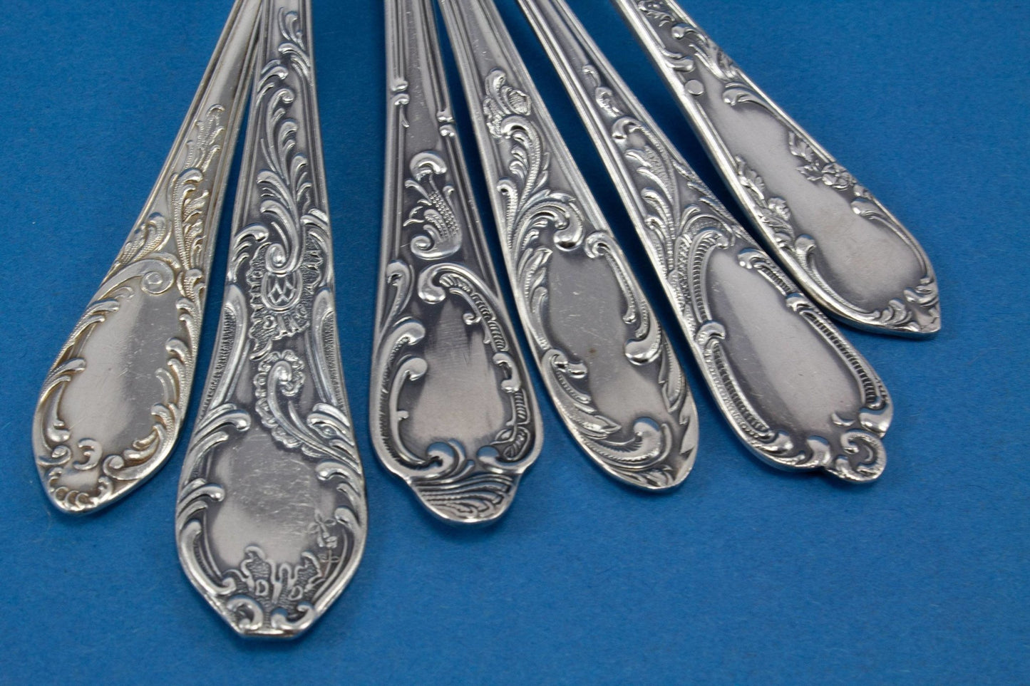 Sechs antike und versilberte Vintage Kuchengabeln mit verschiedenen, eindrucksvollen Dekoren des Rokoko.