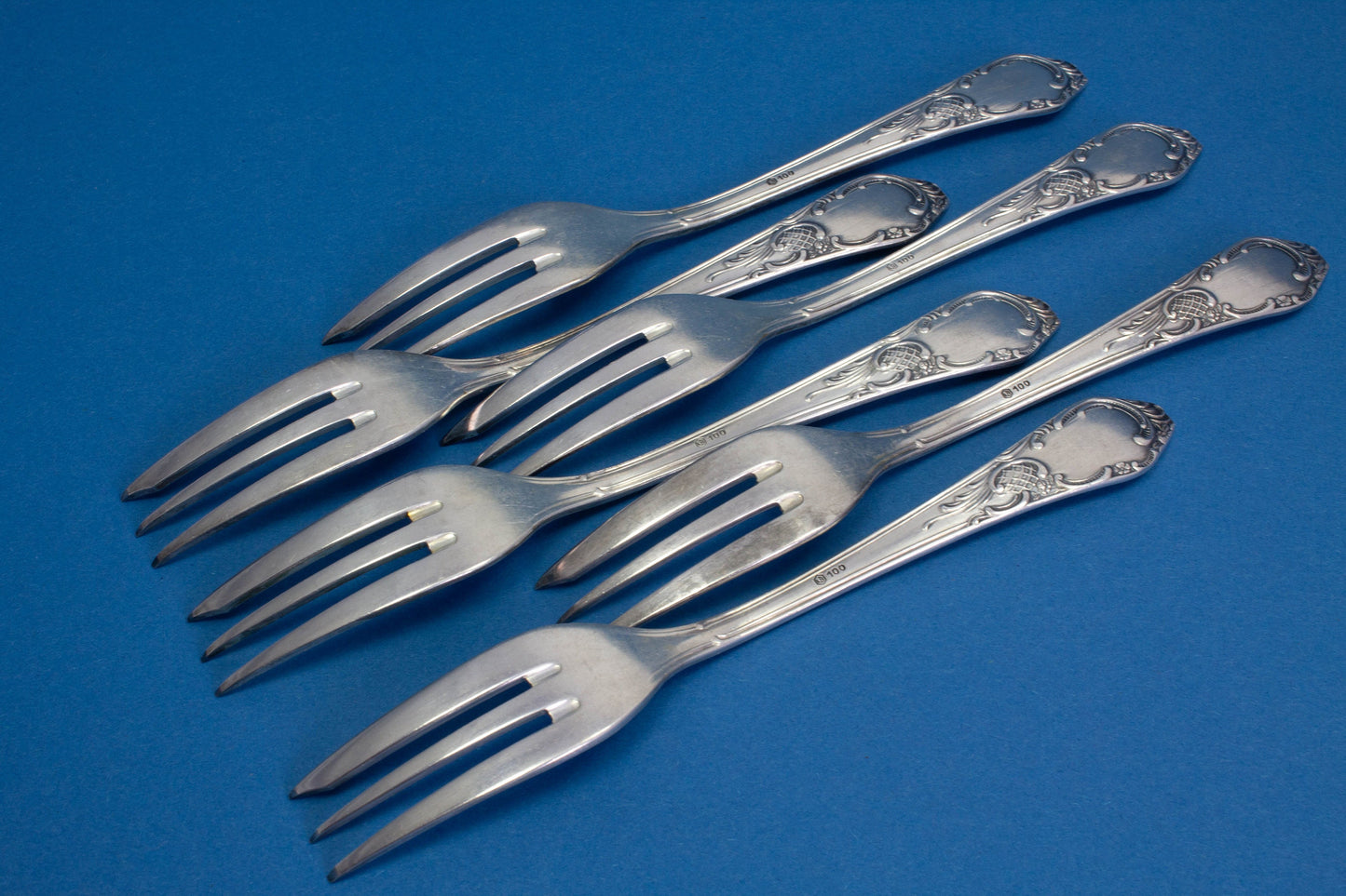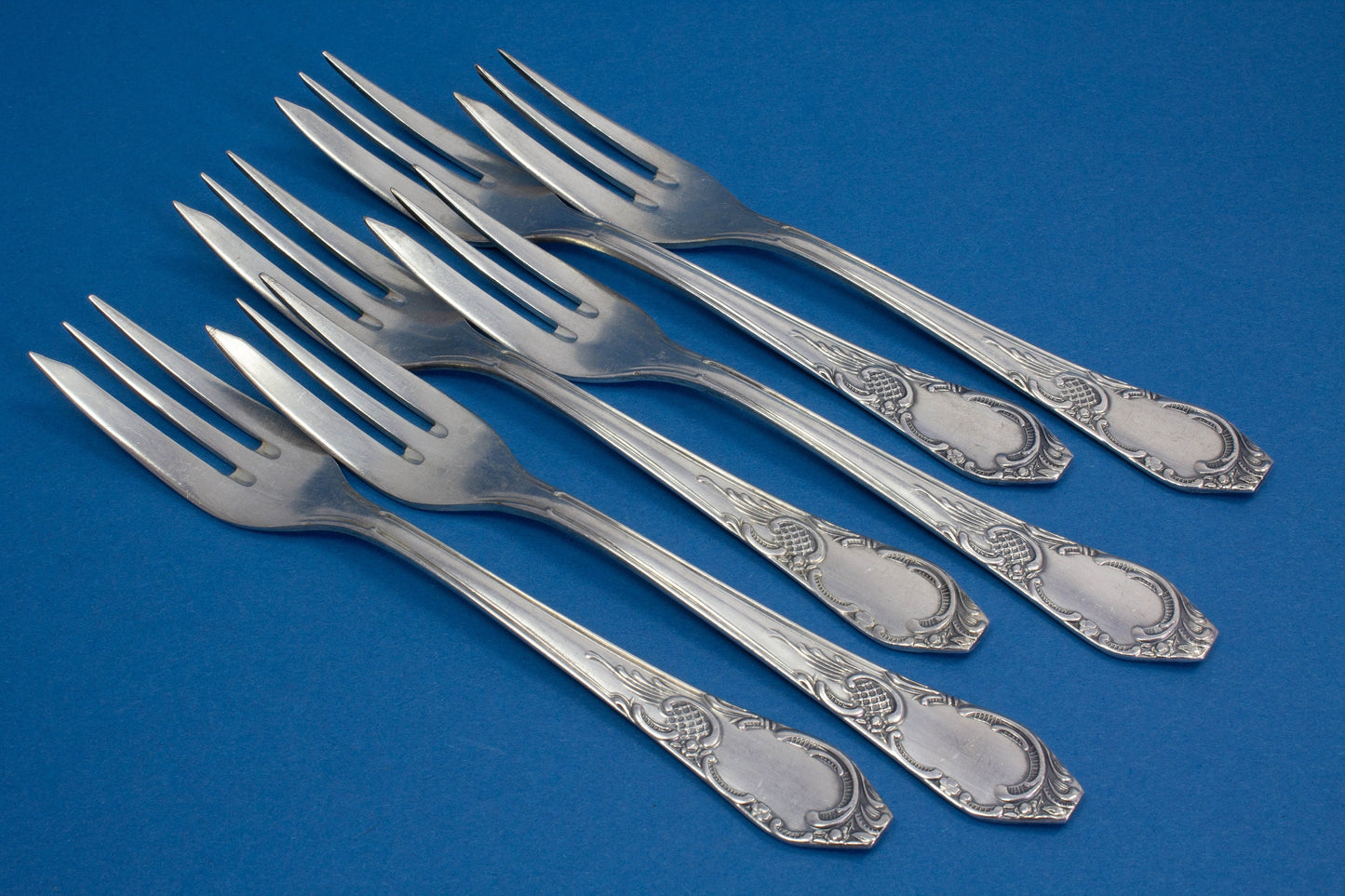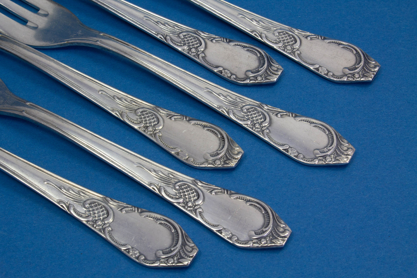Sechs versilberte Kuchengabeln im Rokoko-Stil. Schöne Gabeln für besondere Momente.