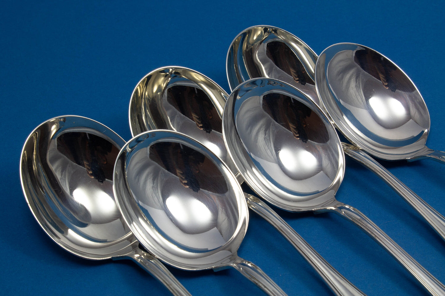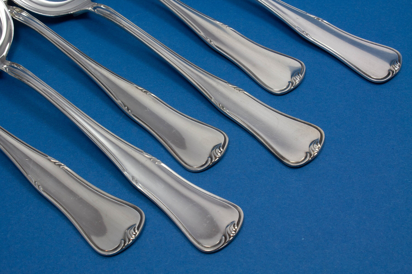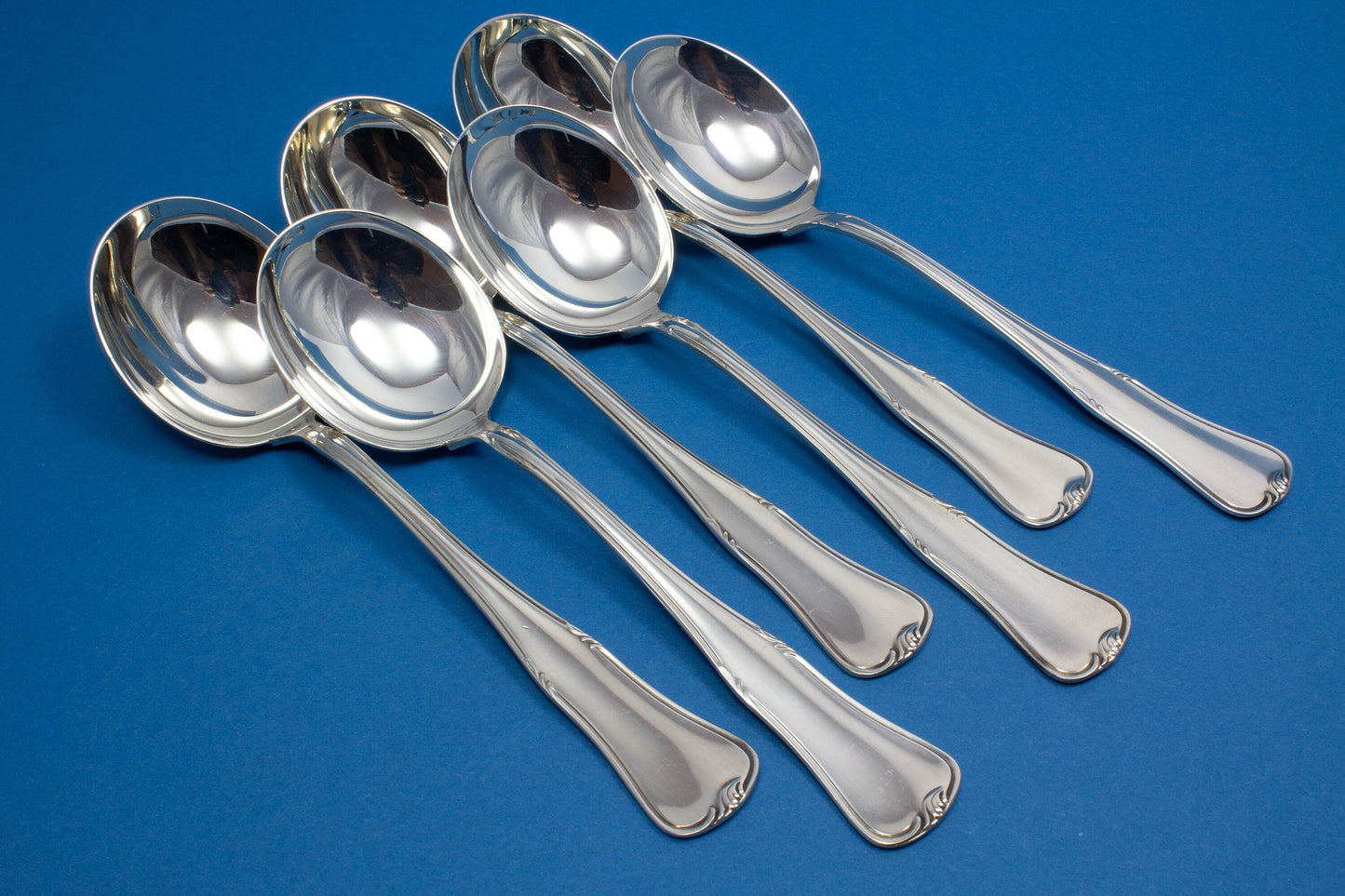 6 versilberte Tassenlöffel, Suppentassenlöffel, WMF 3700