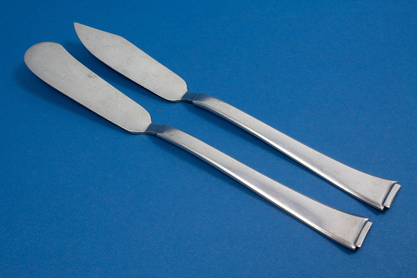 Dieses hübsche Set besteht aus einem Buttermesser und einem Käsemesser. Zwei schöne Art-Déco-Bestecke für einen Snack, einen Brunch oder ein herzhaftes Frühstück.