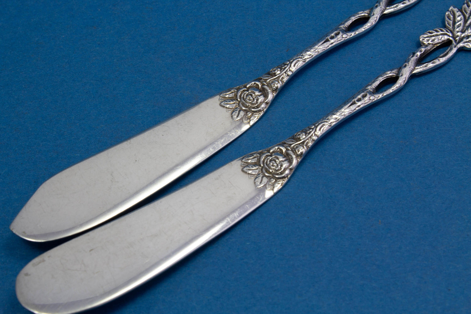 Sehr hübsches silbernes Besteck Set bestehend aus Buttermesser und Käsemesser mit feinem Rosendekor.