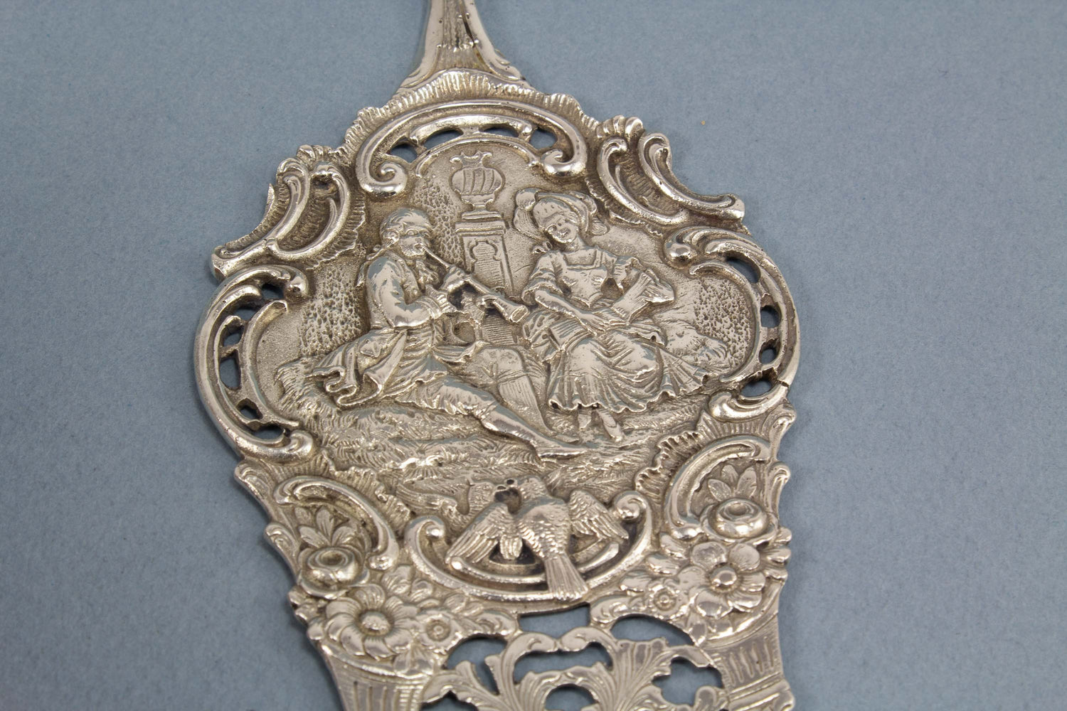 Edler silberner Gebäckheber mit einer Liebesszene, musizierendes Paar und Turteltauben, 800er Silber