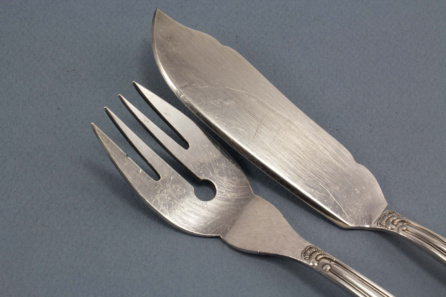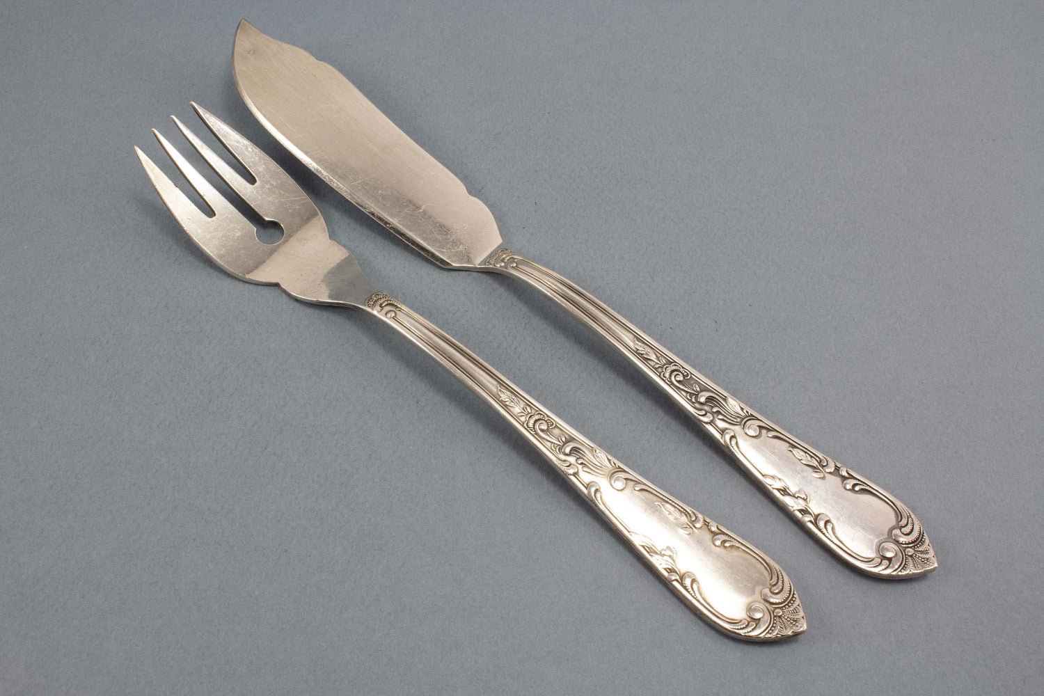 Fischbesteck für eine Person, Fischmesser, Fischgabel, versilbert, Rokoko